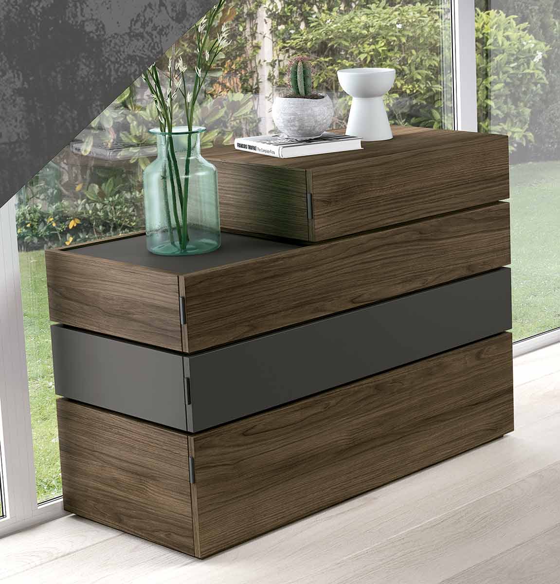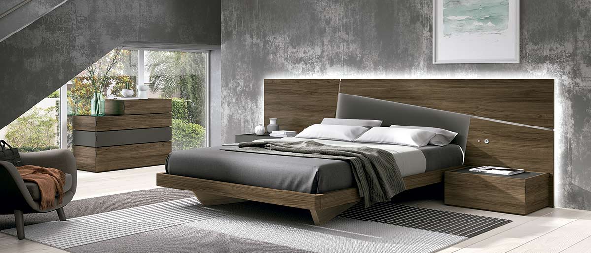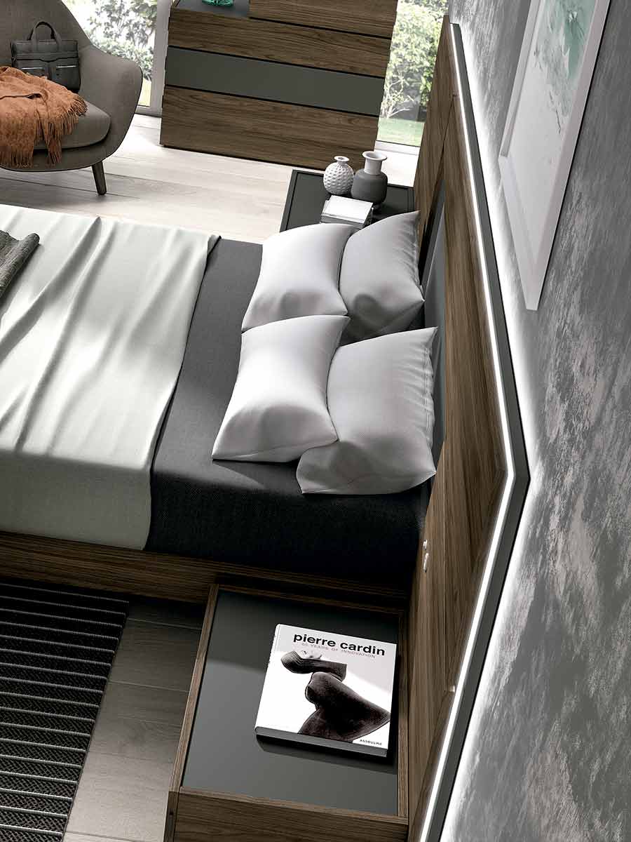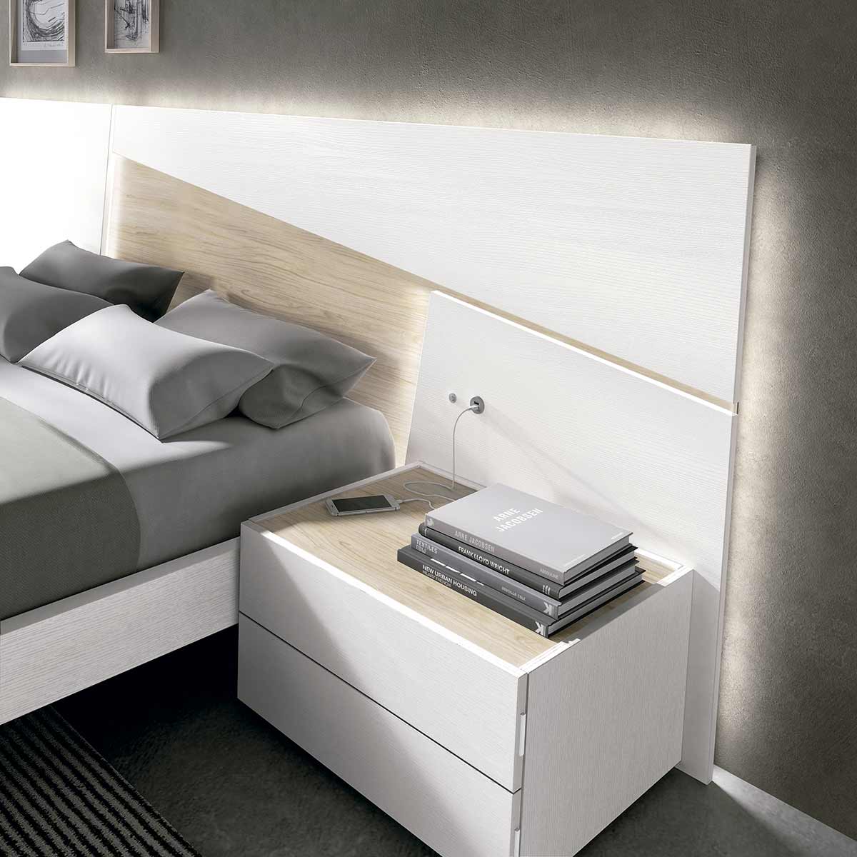 El cabecero de cama lleva luz led incorporada remarcando las líneas puras de los plafones dejando salir una silueta con un efecto visual excepcional. En las mesitas se ha buscado la sobriedad y sencillez, para destacar el cabecero cama, la marca ofrece otros modelos de mesitas de noche como podemos encontrar en los detalles fotográficos además de diferentes combinaciones de colores.