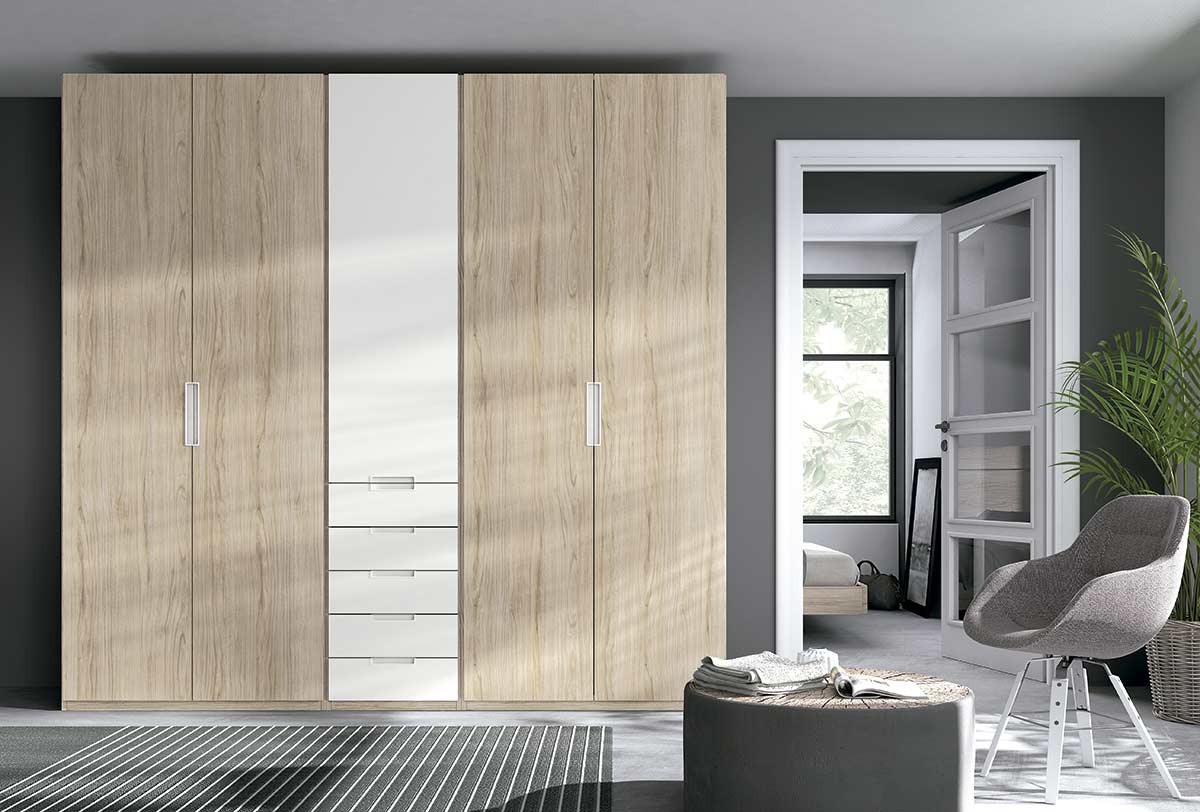 El armario es de 5 puertas batientes y de 5 cajones dispone de medidas desde 208 cm hasta 248 cm y de tres alturas: 220 cm / 240 cm /260 cm, para que se pueda adaptar fácilmente a las medidas de tu dormitorio.