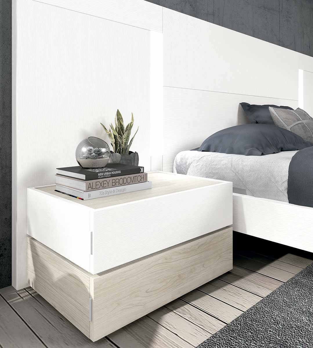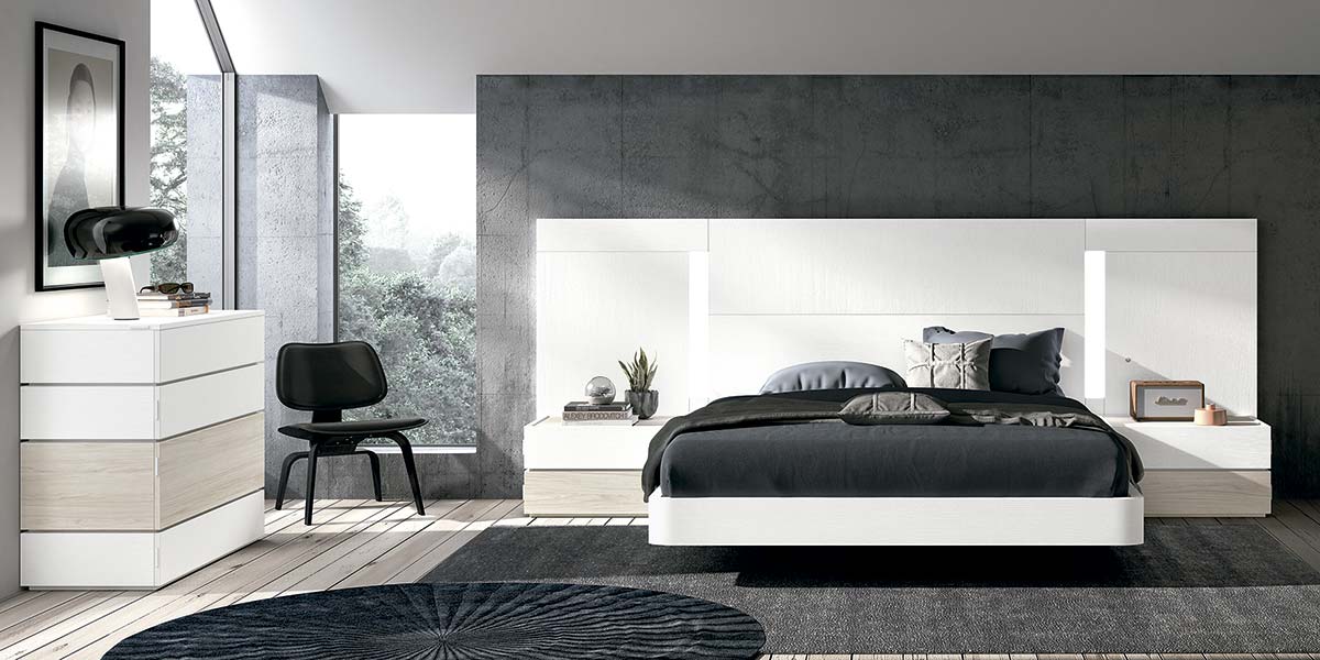 Dormitorio acabado en color Tundra y blanco, siendo el primero un color más suave que el natural que con el blanco obtiene una mezcla muy luminosa. El cabecero de cama con lineas depuradas y lineales lleva incorporadas dos luces led, una en cada lateral destacando su personalidad minimalista.