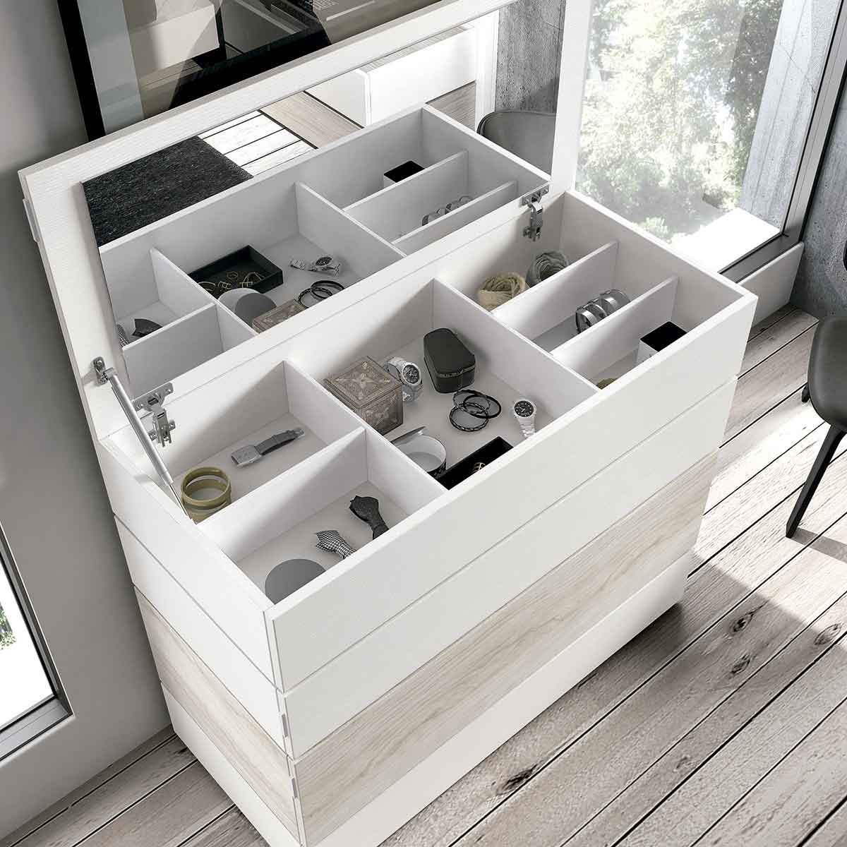 Las mesitas de cajones y la cómoda están construidas a partir de cajones apilados a diferentes alturas, donde es el cliente el que elige el número de cajones que prefiere. La peculiaridad de la cómoda se percibe en el primer cajón siendo este un joyero con espejo tal y como podemos apreciar en las fotografías.