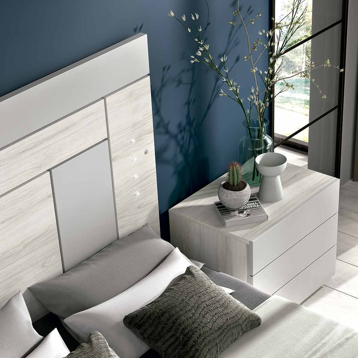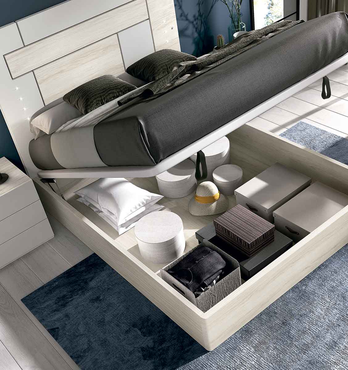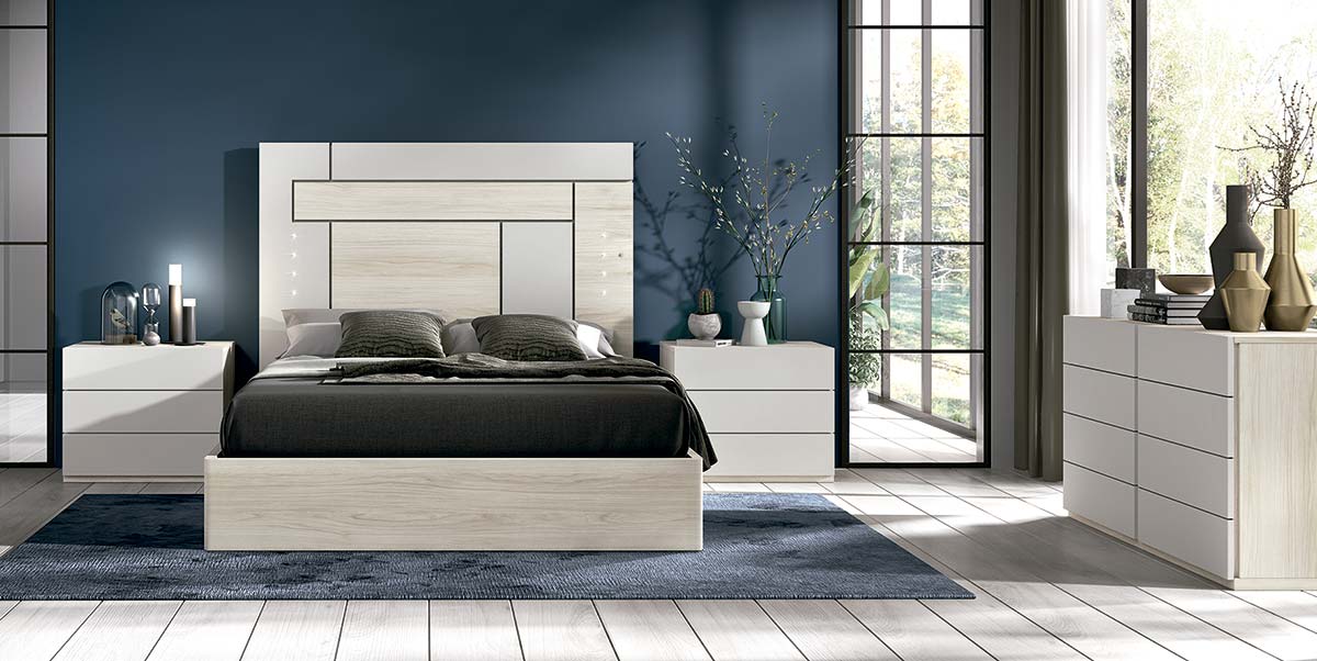Dormitorio de matrimonio con cabezal de cama exento con seis paneles asimétricos donde se puede elegir de manera personal los colores de cada panel. Este cabecero lleva incorporada luz led en cada lateral de panel y como opción se puede integrar un conector con doble cargador USB. Se ha combinado con un canapé abatible con gran capacidad de almacenaje. La combinación de colores elegida, de entre las 14 combinaciones posible, ha sido el acabado Tundra con Lacado Gris.