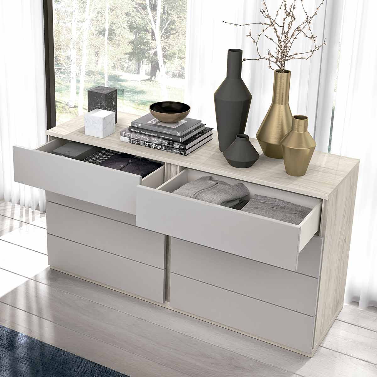 Las mesitas y la cómoda son de la misma colección, los frentes de cajones no llevan tirador y tiene apertura lateral. Si se diera el caso de que en algún montaje el módulo no tiene acceso a la apertura lateral por problemas de espacio opcionalmente se le puede poner tirador. La cómoda es doble con 4+4 cajones, y tiene una medida de 133,8 cm, si no disponemos de tanto espacio existen medidas inferiores a 100,4 cm y 120 cm y también tiene sinfonieres de la misma colección a 55,4cm y 65.4 cm. A esta mesita de noche se le pueden acoplar patas metálicas en color blanco, gris ó pizarra.