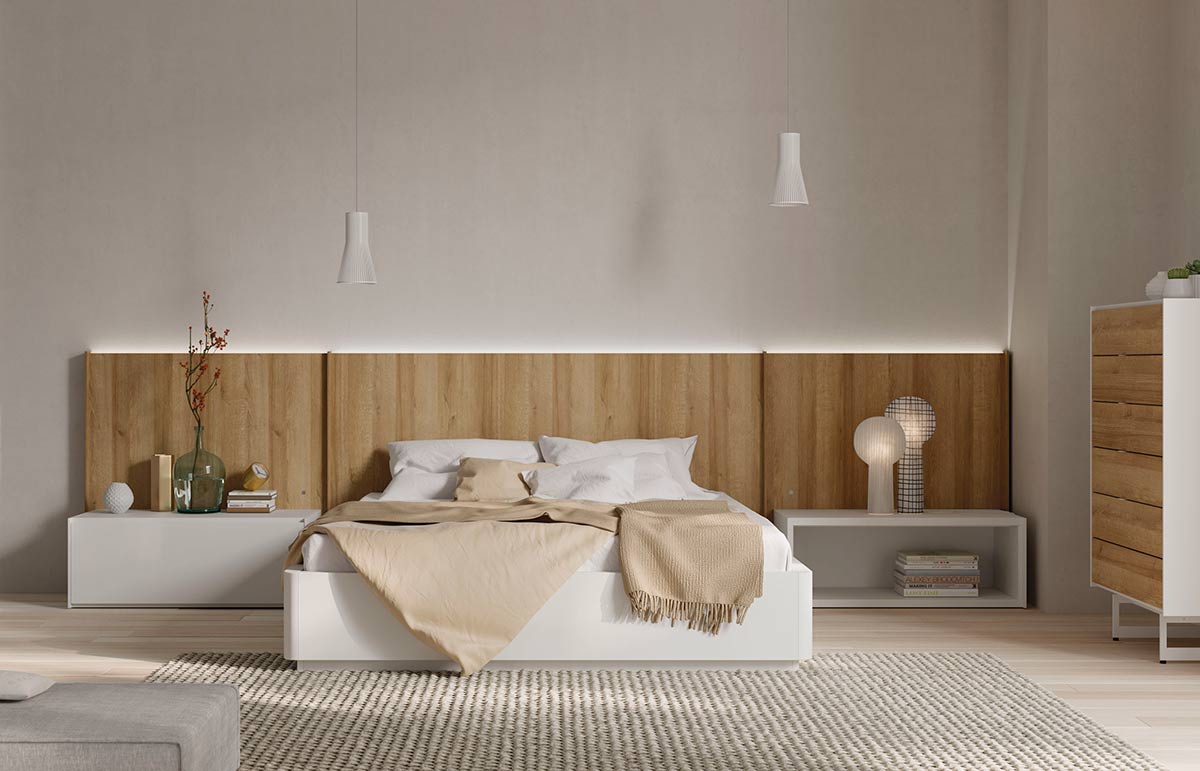 La versión lisa del cabezal New Kandor también se puede equipar con iluminación indirecta led. Además el diseño del cabezal te permite situar el pulsador para encender el led donde más te convenga. En esta composición se muestra una configuración de cabezal central con dos accesorios laterales. El cabezal se puede hacer a la medida de tu dormitorio, para ello tendremos que saber la medida de tu colchón y el ancho de mesitas que deseas.