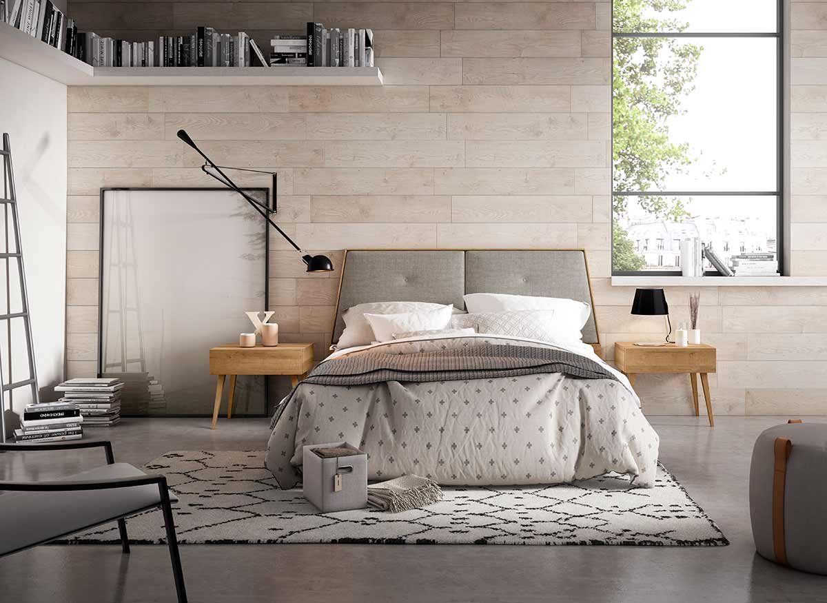 Las mesillas de noche DEN en canela, con patas de madera del mismo color complementan el ambiente. Sé pueden colocar tanto la toma de USB como el cargador inalámbrico sobre las tapas de estas mesillas.