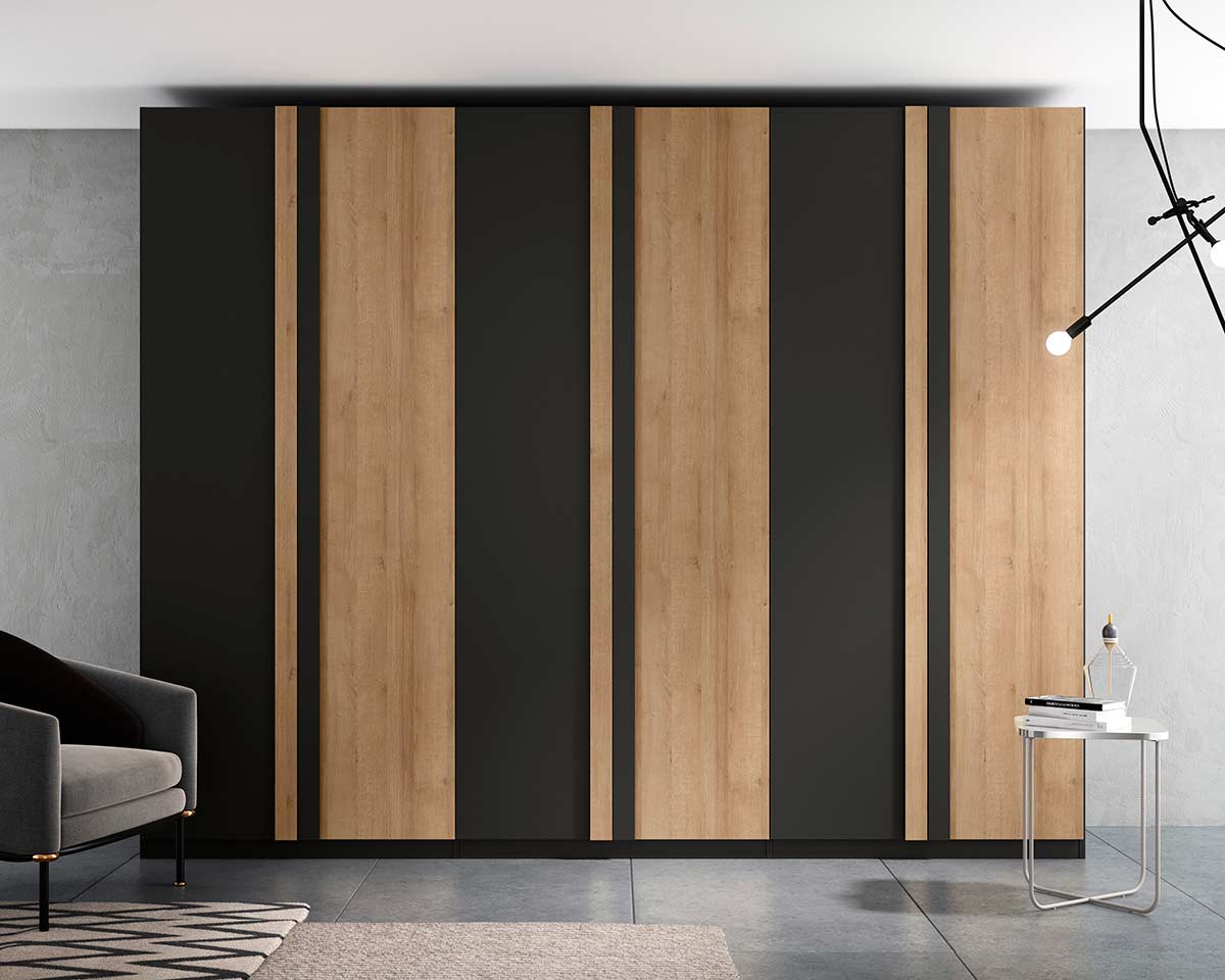 Se ha combinado con un original armario de 6 puertas ZEBRA, la versatilidad de la fachada de este armario se hace evidente en esta composición. Un sencillo juego de colores que impacta a primera vista. Esta marca dispone de multitud de interiores para armarios predefinidos. El equipar tu interior de armario ropero al detalle nunca había sido tan sencillo. Dispones de tres alturas de armario 220 cm, 240 cm y 260 cm.