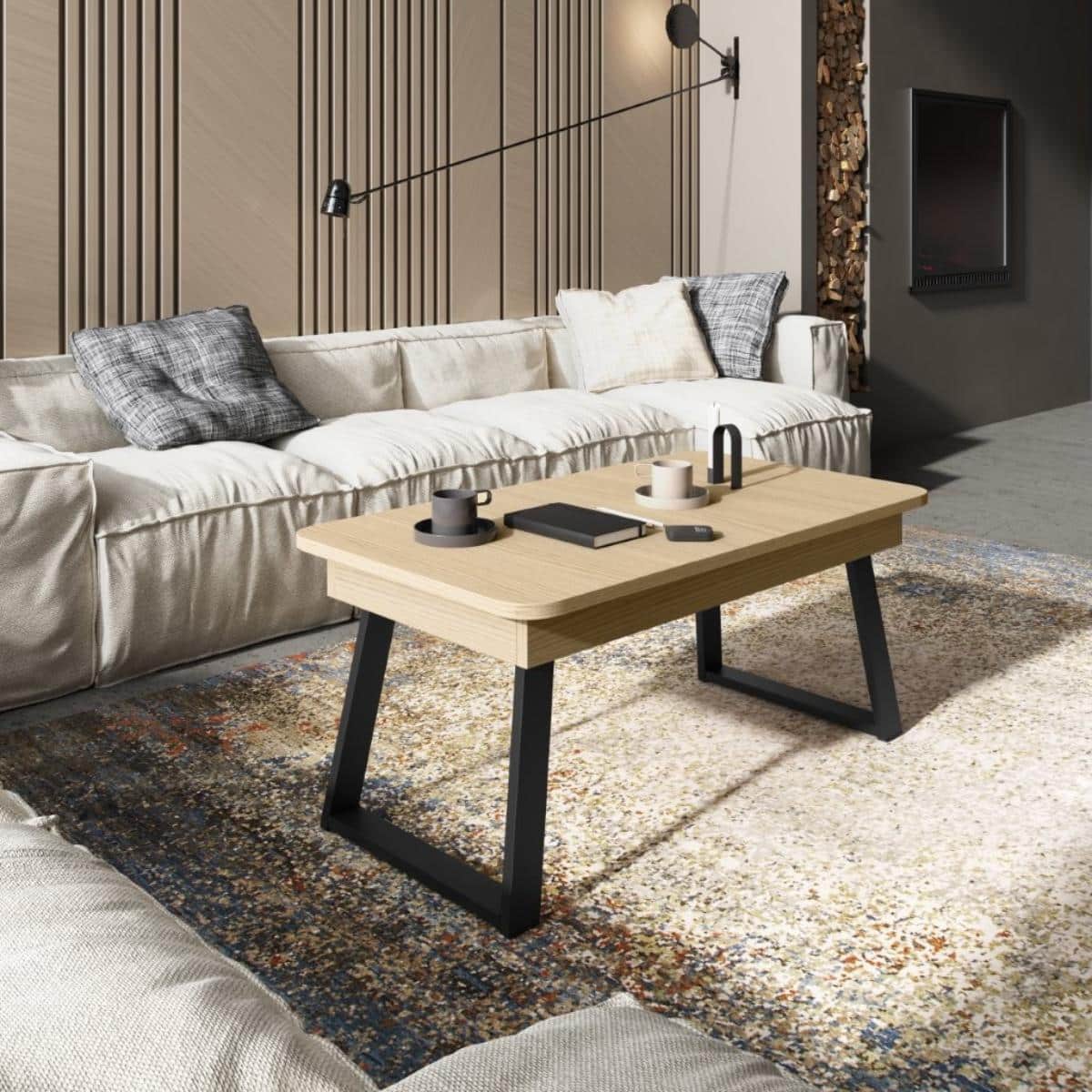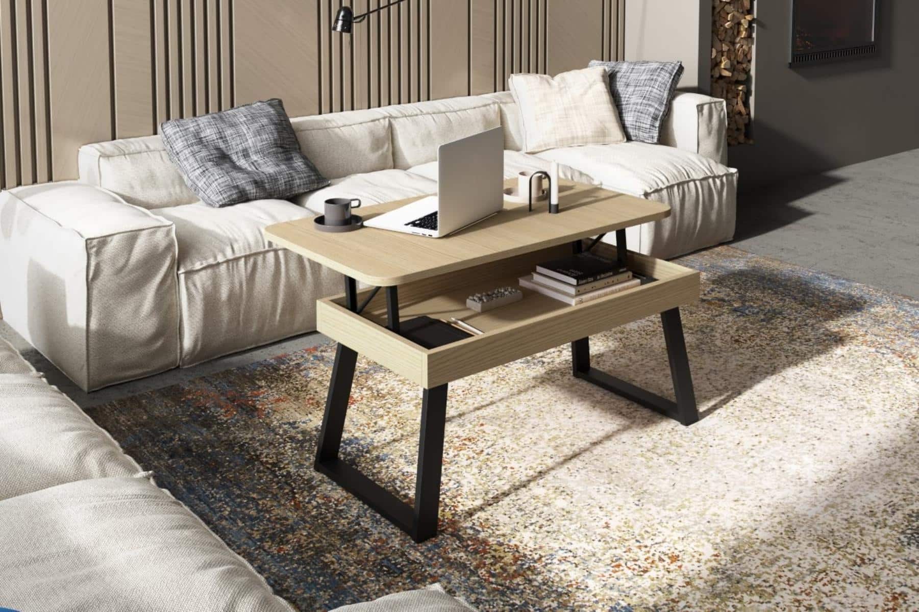 La funcionalidad es la protagonista gracias a su mecanismo elevable, que permite situar la tapa a la altura ideal para trabajar con comodidad o disfrutar de una cena relajada sin abandonar el sofá. Al elevarse, la mesa no solo mejora la ergonomía, sino que revela un práctico espacio de almacenaje oculto, ideal para mantener el orden en el salón guardando mandos, revistas o dispositivos electrónicos fuera de la vista pero siempre a mano.