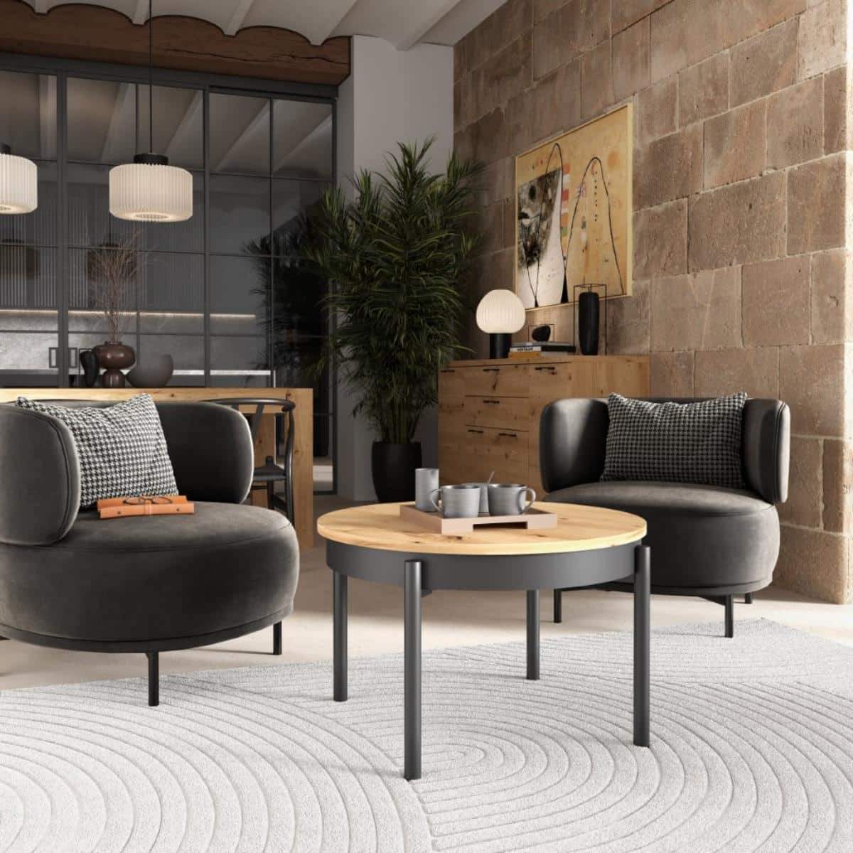 Nuestra mesa de centro redonda de 72 cm de diámetro es la solución ideal para quienes buscan optimizar el espacio sin renunciar al diseño. Su formato circular suaviza las líneas del salón y facilita la circulación, convirtiéndose en una pieza clave para estancias compactas o para crear ambientes más fluidos. El diseño se completa con unas elegantes patas metálicas cilíndricas, que aportan una estética minimalista y una base de apoyo firme, elevando el estilo industrial hacia un look más sofisticado y ligero.
