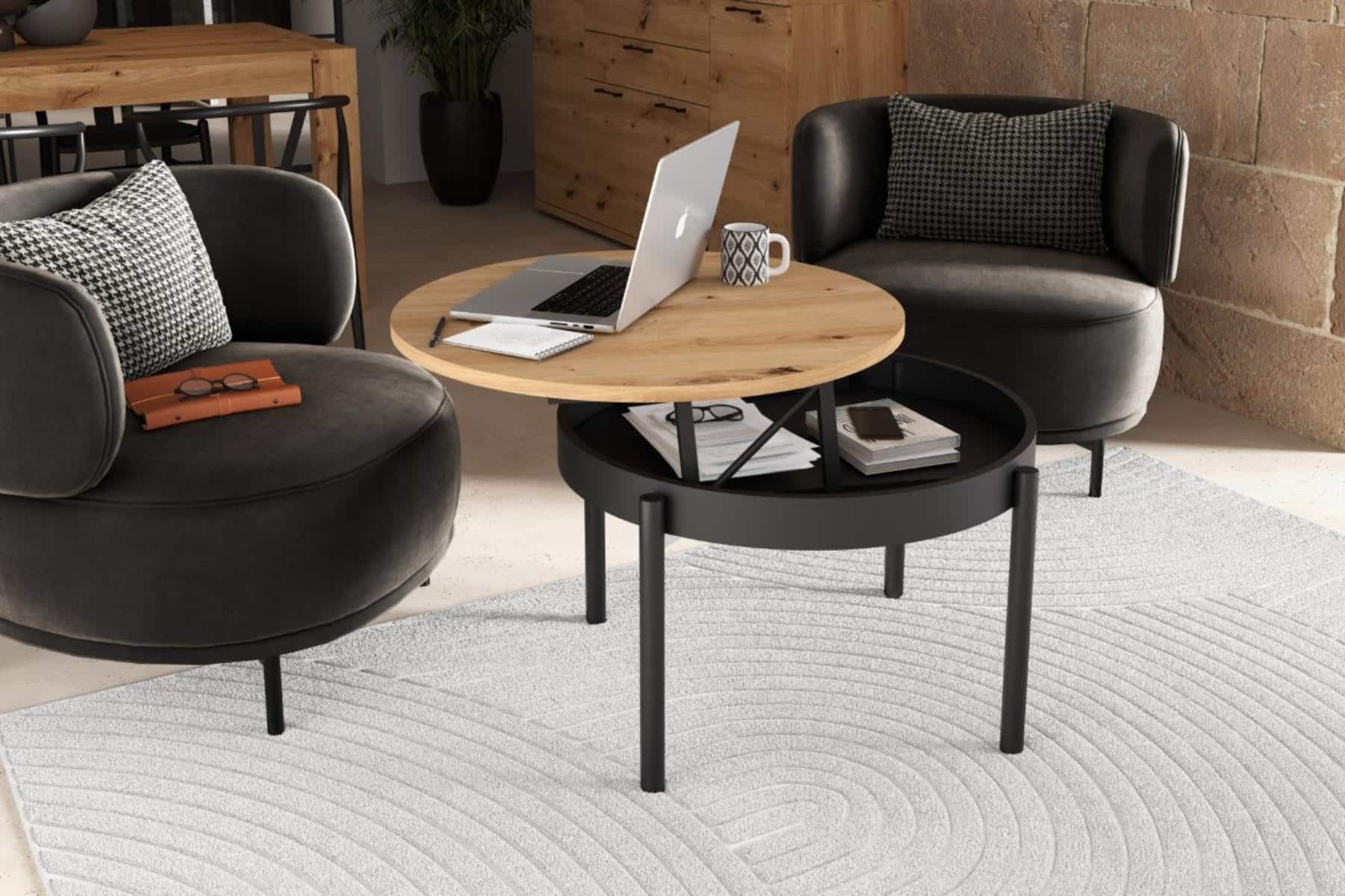 A pesar de su formato compacto, esta mesa sorprende por su mecanismo elevable, que sitúa la tapa a la altura perfecta para cenar de forma relajada o utilizar dispositivos electrónicos desde el sofá. Además, este sistema revela un compartimento de almacenaje interior, un espacio discreto y funcional diseñado para guardar esos pequeños objetos cotidianos que suelen quedar a la vista, manteniendo siempre la armonía y el orden en tu zona de estar.