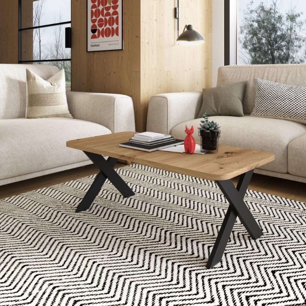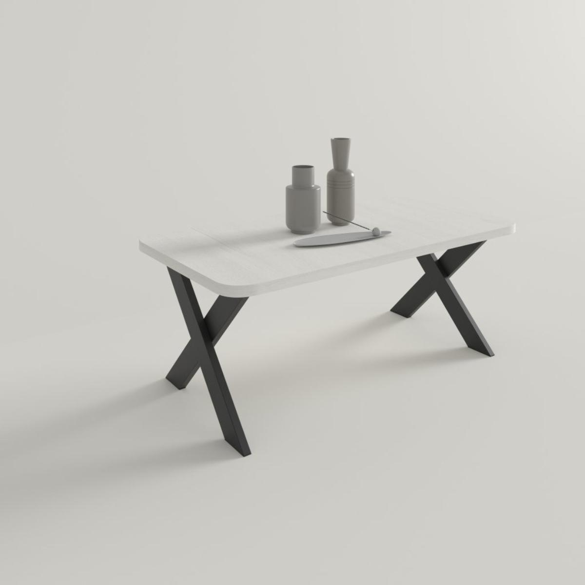 La solidez visual de la tapa se apoya sobre unas potentes patas metálicas en “X”, un diseño de inspiración arquitectónica que aporta una estabilidad inquebrantable y un marcado carácter industrial. Al prescindir de mecanismos internos, la mesa gana en limpieza visual y robustez, ofreciendo una superficie de apoyo amplia y siempre lista para su uso. Es la opción ideal para quienes priorizan un mueble minimalista, duradero y con un diseño de gran impacto decorativo.