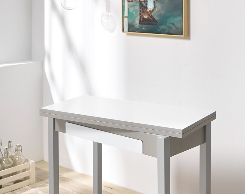 Siempre en color blanco combinada con el armazón y las patas en aluminio, acompañada con un cajón para guardar los objetos que queremos tener a mano.