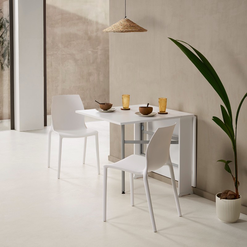 Tenemos la solución, mira que mesa más práctica y cómoda, es una mesa cónsola que mide 77 cm de largo x 20 cm de fondo cuando está cerrada, con dos alas donde si abres una parte mide 77 cm largo x 83 cm fondo y si abres las dos alas mide 77 cm de largo x 150 cm fondo. El sistema de apertura automática te facilitará el día a día.