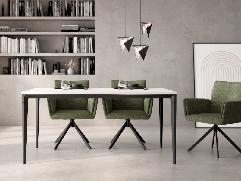 Esta mesa de comedor rectangular combina elegancia moderna con funcionalidad, ofreciendo una amplia gama de opciones para personalizar tu espacio. La tapa, disponible en diversos colores y acabados, se adapta a cualquier estilo decorativo, desde el minimalista hasta el contemporáneo. La estructura metálica, robusta y de líneas limpias, se ofrece en dos acabados: marfil, para un ambiente cálido y luminoso, o negro, para un toque de sofisticación y contraste.