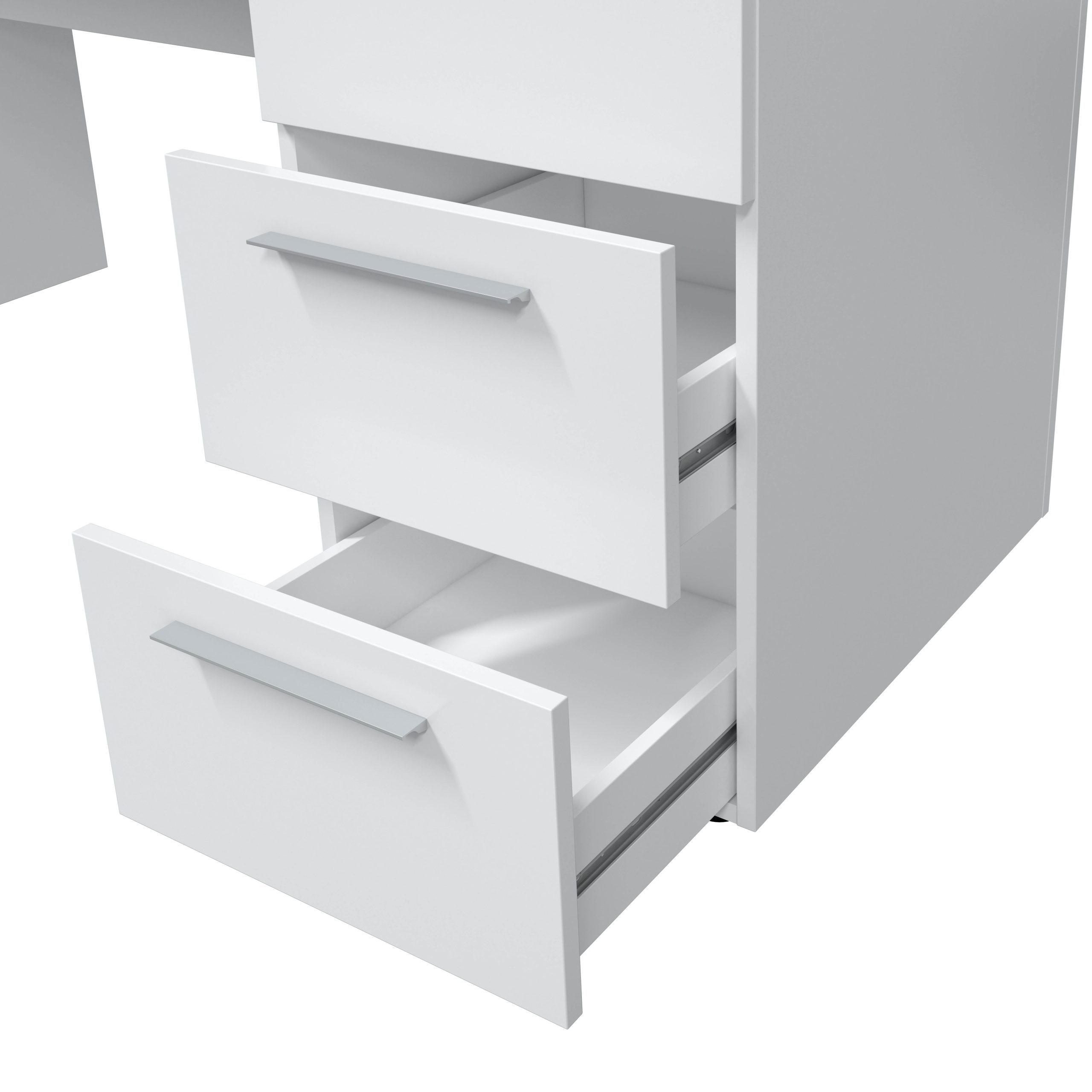 · Piezas: Tablero de partículas melaminizado. Clasificación según contenido o emisión de formaldehído TIPO E1. Espesor: 30mm, 22mm y 15mm. · Cantos: P.V.C. Espesor: 0,6mm. · Cajones: Tablero de fibras de densidad media lacado. (MDF/DM). Espesor: lados 12mm y fondo 3mm. Acabado en blanco. · Guías correderas metálicas para los cajones (no extraíbles). · Tacos ABS (termoplástico de alta resistencia) quitarruidos y an rayas para la parte inferior del mueble. · Tiradores metálicos efecto cromo brillo.