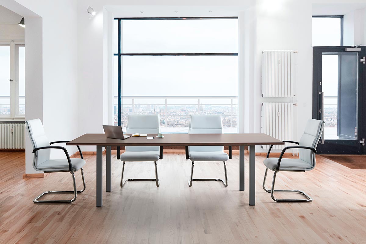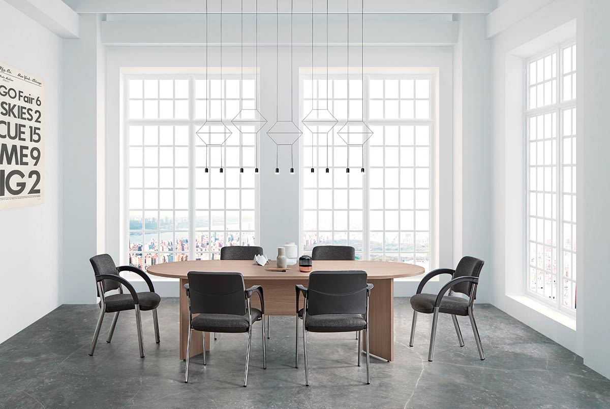 Mesas de reunión con diseño actual y estilo ligero disponibles con diferentes tipos de patas y formas de tapas, ovaladas, rectangulares y circulares.