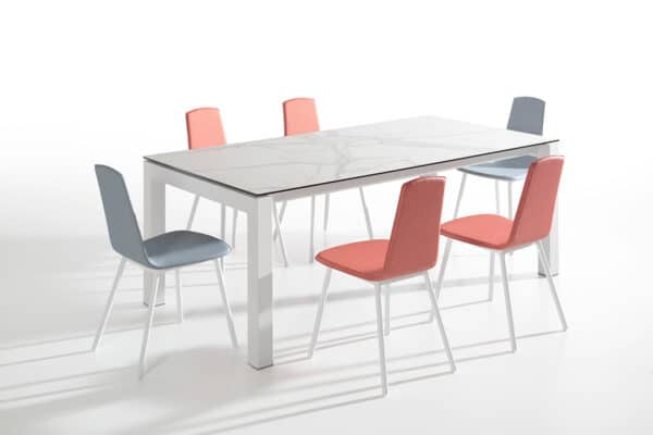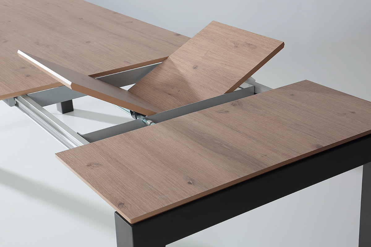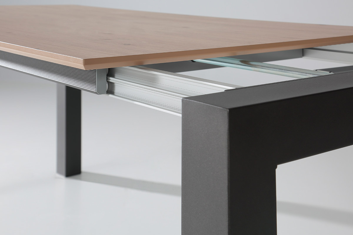 Se trata de una mesa extensible con un sistema de apertura lateral con desplazamiento de patas. Las guías son de aluminio anodizado con patines, ejes de acero y patas con doble rueda para facilitar la apertura. Tiene doble extensible de 40cm + 40 cm, para las medidas de mesa hasta 160×100, para medidas superiores el doble extensible será de 50cm+50cm. La función del doble extensible nos permite abrir la mesa según nuestra necesidad, podemos abrir uno ó bien los dos.