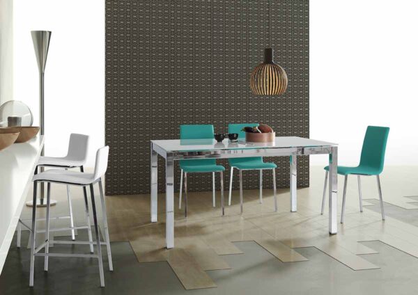 Dina es un concepto de mesa minimalista, sencilla y resistente con un sistema de doble extensión. Esta mesa de cocina se puede elegir con patas metálicas y también con patas de madera. Si elegimos la opción de patas metálicas se pueden elegir en Cromo brillo, ó pintadas en epoxi color plata, blanco, negro ó carbono.