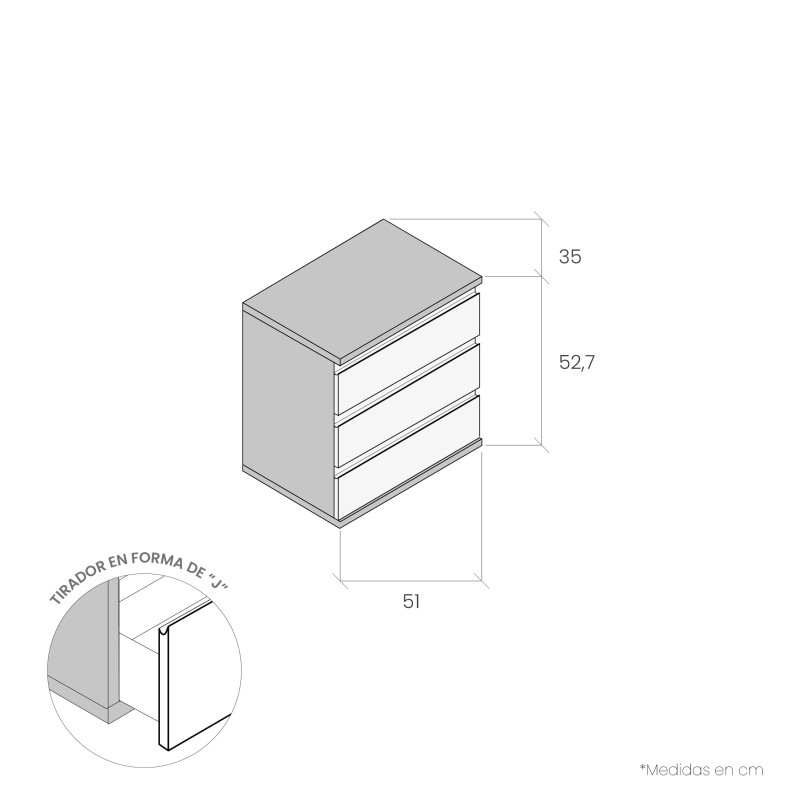 Mesita de noche de 3 cajones de 51 cm (ancho)
