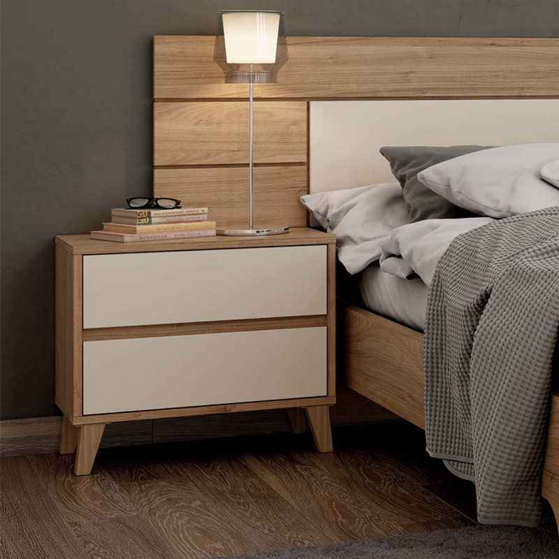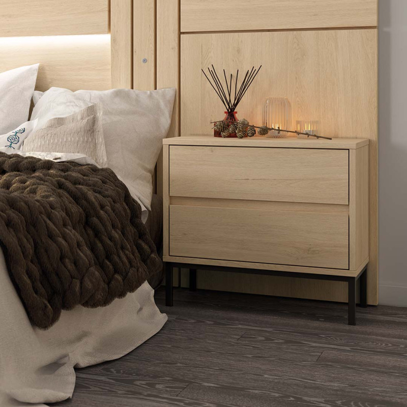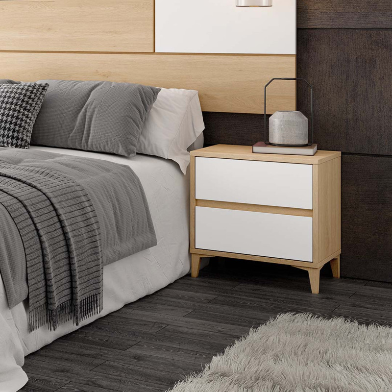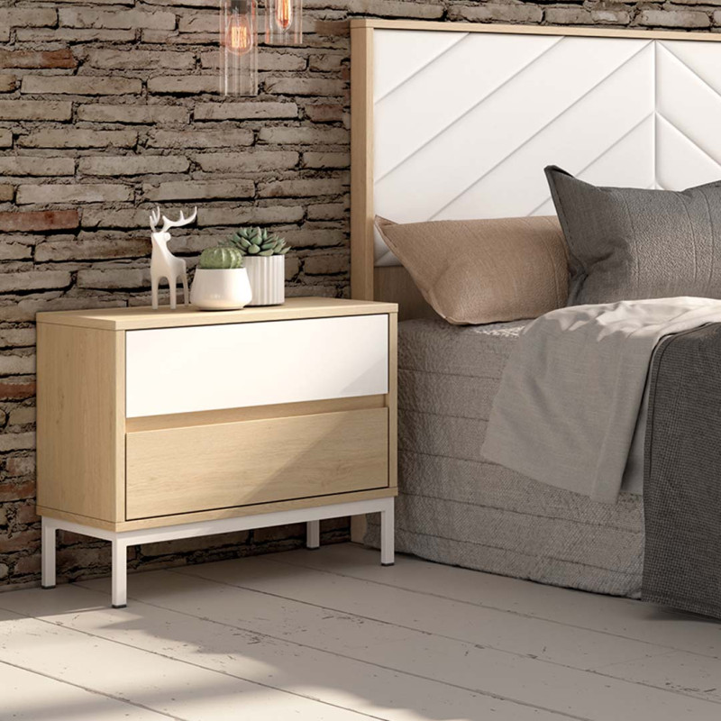 Mesita de noche de 2 cajones con costado lateral visto, estilo nórdico, tirador uñero y gran capacidad