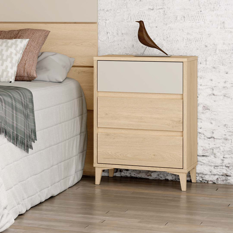 Mesita de noche de 3 cajones con costado lateral visto, estilo nórdico, tirador uñero y gran capacidad