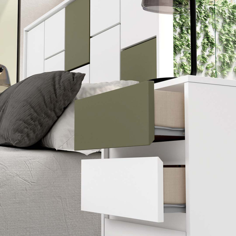 Fabricado con panel melamínico de madera reciclada, mediante un proceso productivo de calidad, contribuyendo así a ser muy respetuosos con el medio ambiente. Las características mas importantes son: - Fabricados con madera siguiendo criterios de respeto con la naturaleza. - Es un material no tóxico. - No pierde intensidad de color, ni con el paso del tiempo, ni por efecto de la luz. - Facilidad de limpieza. - Resistente al calor y a las manchas. - Resistente a los rozamientos y al rayado. - Uniformidad visual de los muebles en su conjunto. - No provoca reacciones alérgicas. - Los cajones se desplazan sobre guías metálicas.