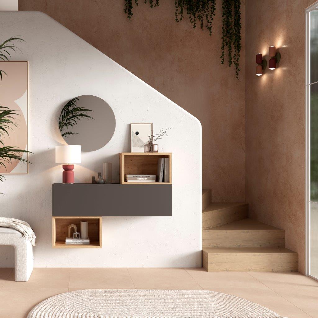 Define tu entrada con este recibidor de diseño contemporáneo y original. Su espejo redondo suaviza las líneas y aporta un toque distintivo, además de ampliar la luz natural. Presenta un módulo superior con puerta en color ebano y dos módulos abiertos con acabado en artisan, creando un contraste visual atractivo y ofreciendo espacio para almacenamiento y decoración. Ideal para quienes buscan un recibidor moderno, funcional y con un marcado carácter estético.