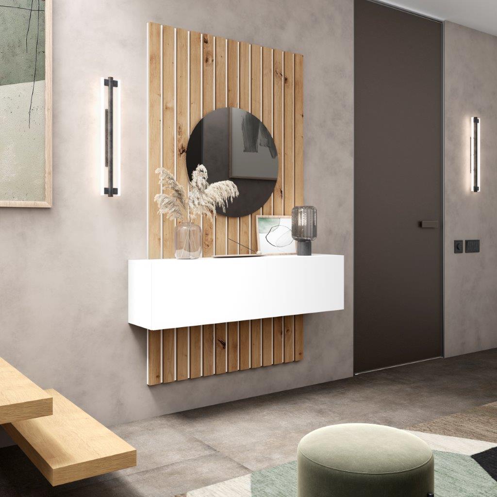 Recibidor de 120 cm con panel palilleria y espejo redondo