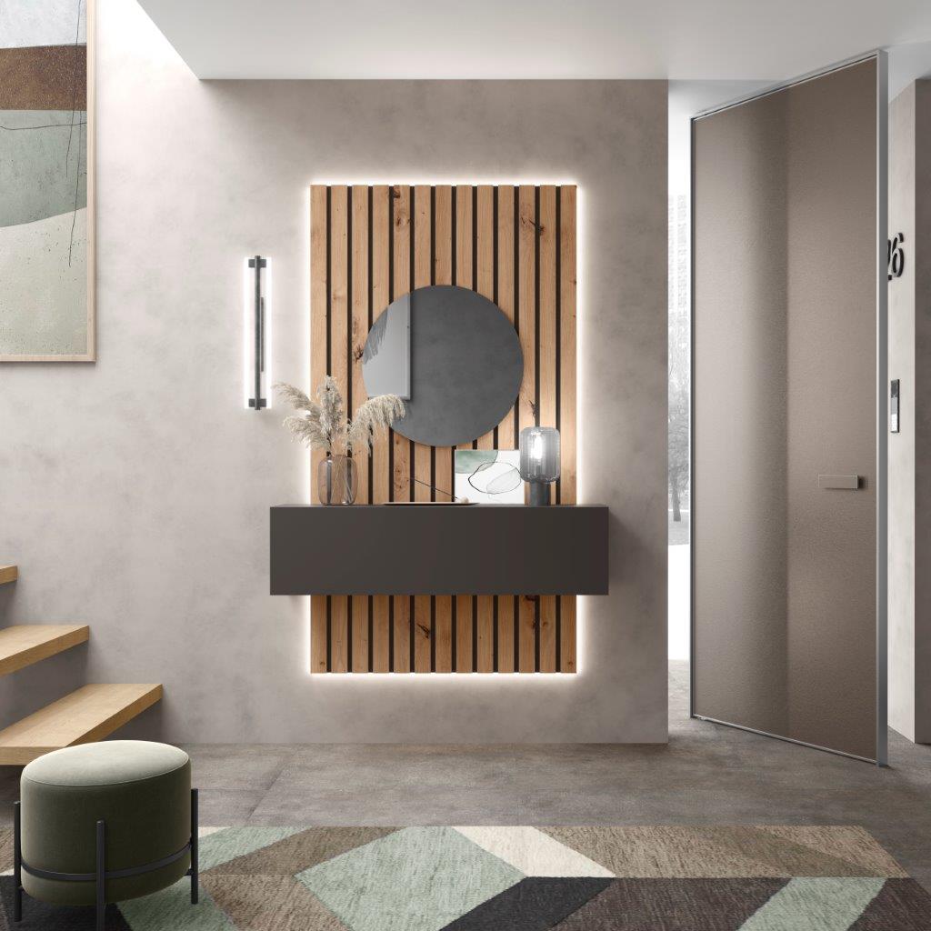 Transforma tu entrada con este recibidor de diseño contemporáneo que fusiona calidez y modernidad. Su llamativo panel de palillería vertical en madera clara crea una textura visual interesante y acogedora. En el centro, un espejo redondo suaviza las líneas y aporta un toque de elegancia, además de reflejar la luz natural. Se complementa con un módulo suspendido en color ebano, ofreciendo una superficie práctica y despejada para tus objetos esenciales. Este recibidor es la pieza perfecta para quienes buscan un diseño original y funcional para su hogar.