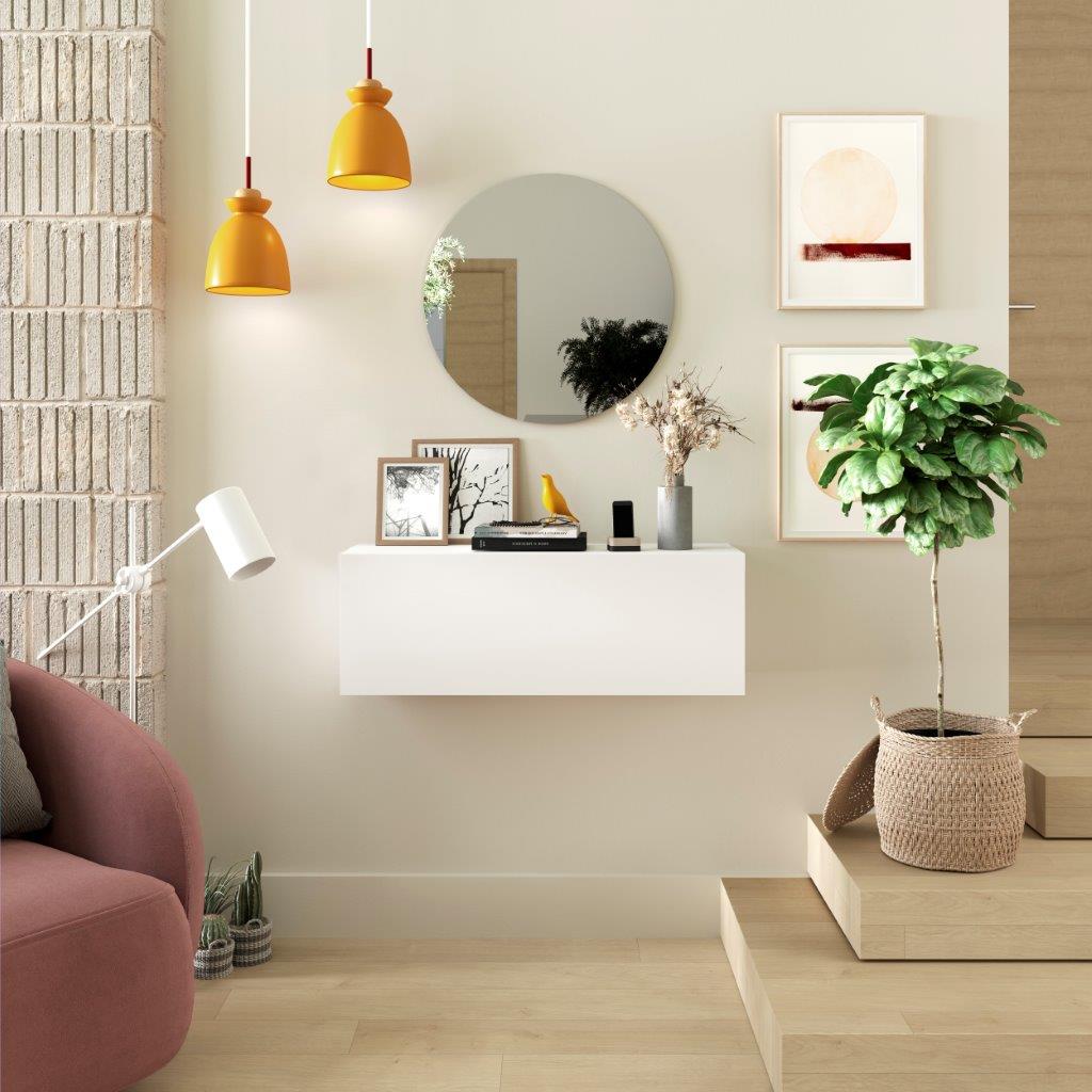 Dale un toque de luz y modernidad a tu entrada con este recibidor de líneas puras. Su espejo redondo parece flotar en la pared, aportando amplitud y un diseño elegante y sencillo. La consola suspendida en color blanco ofrece una superficie despejada para tus objetos decorativos o esenciales, manteniendo un ambiente ligero y ordenado. Este recibidor es ideal para quienes buscan un estilo minimalista y funcional sin renunciar a un toque de sofisticación.