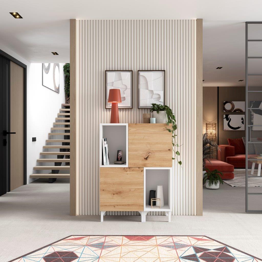 Define tu entrada con este recibidor de diseño contemporáneo y dinámico. Presenta dos módulos de puerta con un cálido acabado en color artisan, ofreciendo un almacenamiento discreto y funcional. Se complementan con dos huecos abiertos en color blanco, creando un atractivo contraste visual y proporcionando espacios adicionales para organizar o exhibir tus objetos decorativos favoritos. Su diseño modular y la combinación de materiales aportan un toque moderno y versátil a cualquier hogar. Ideal para quienes buscan un recibidor con personalidad y soluciones de almacenamiento prácticas.