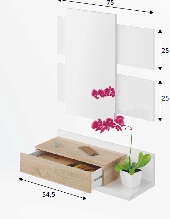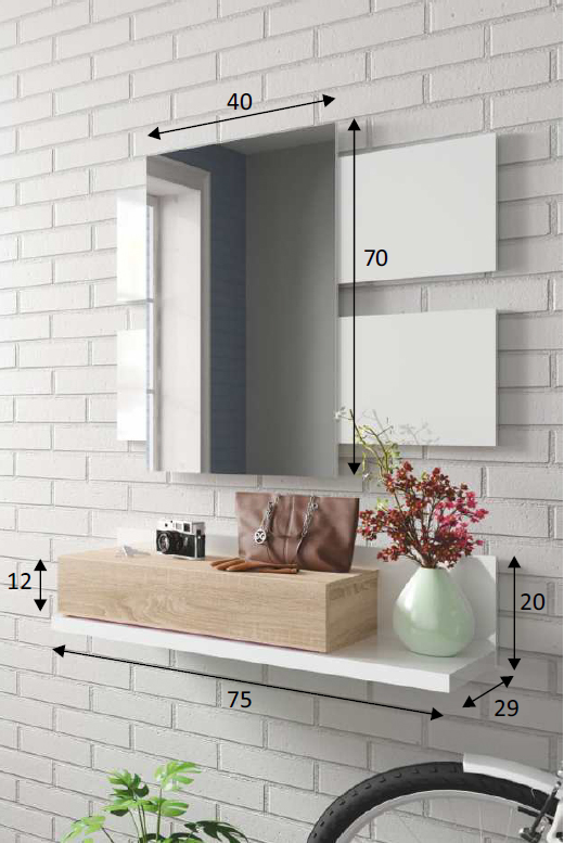Mueble de 75 cm ancho x 29 cm fondo x 20 cm alto. ' Espejo 40 cm ancho x 3,3 cm fondo x 70 cm alto.