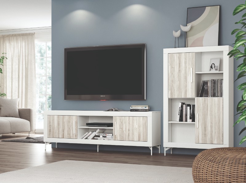 Estas son las dos piezas por excelencia principales para tu salón comedor, un bajo TV con una dimensión de 1,80 para que puedas poner un televisor bastante amplio y un módulo de 2 puertas y 4 huecos, ideal para almacenar piezas de vajilla en las puertas y libros o bonita decoración en los huecos. Con estas dos piezas solamente conseguimos la composición ideal y práctica que nos hace falta para nuestro hogar.