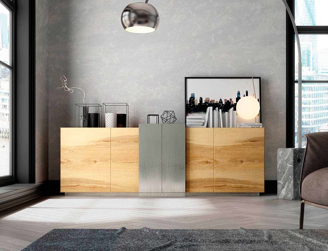 Precioso aparador salón, con un diseño muy moderno e innovador. Con líneas muy puras, no tiene tiradores, en su lugar tiene unos bonitos plafones centrales, que a su vez hacen el papel de tirador.