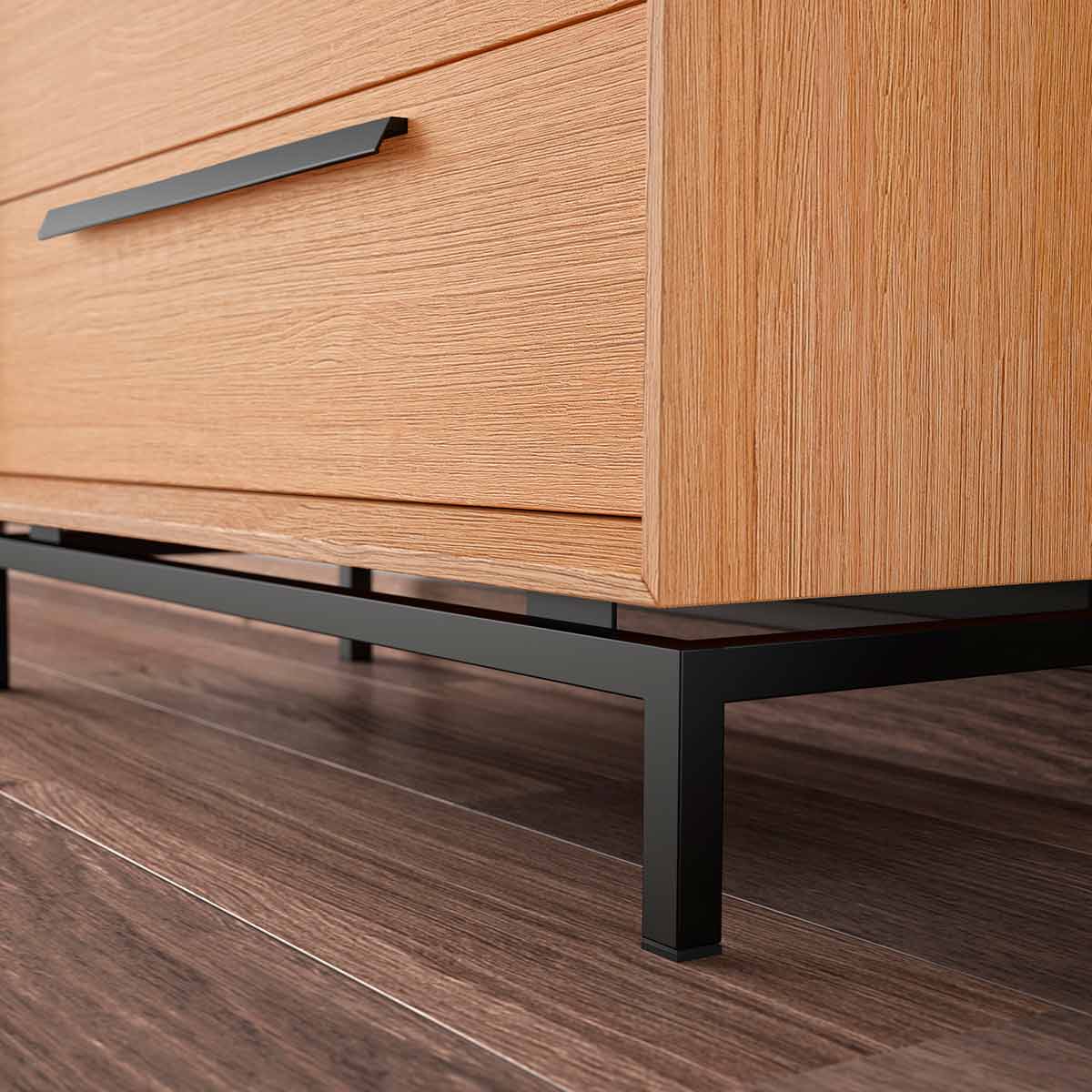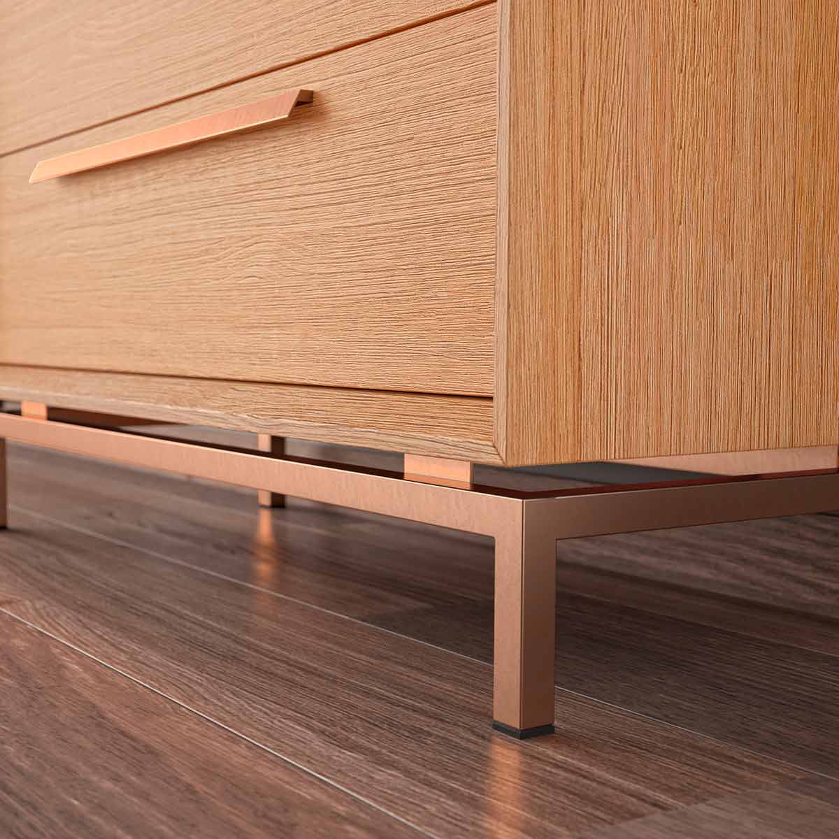 El tirador, la bancada y el marco de puerta se puede elegir en los acabados negro, cobre y oro. Disponen de una gran variedad de medidas de mesas de comedor y de mesas de centro, con los mismos acabados que el aparador.