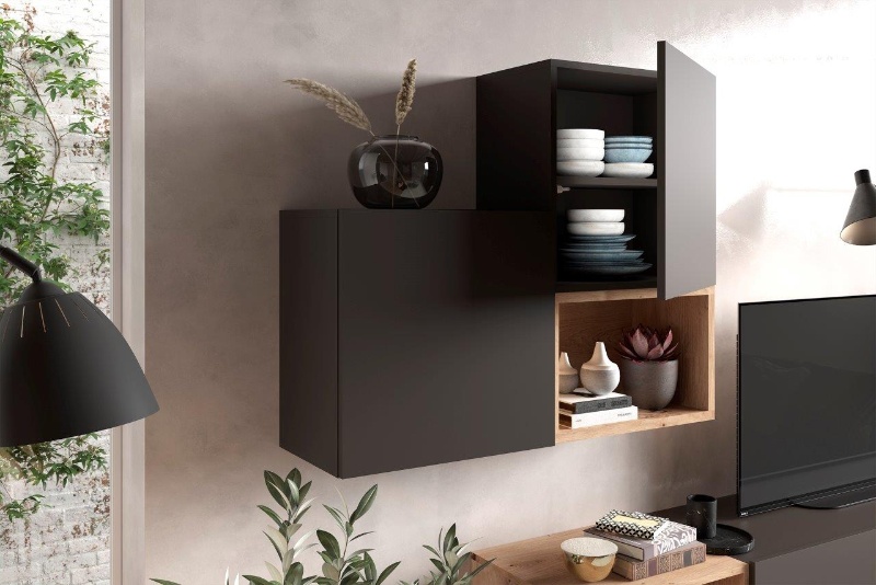 Una composición colgada que no solo es práctica sino también súper estilosa. Tienes un módulo con puerta abatible que oculta tus cosas y mantiene todo ordenado y fuera de la vista. Luego, hay dos cubos cerrados, perfectos para almacenar cosas importantes sin que estén a la vista, manteniendo un look limpio y organizado.