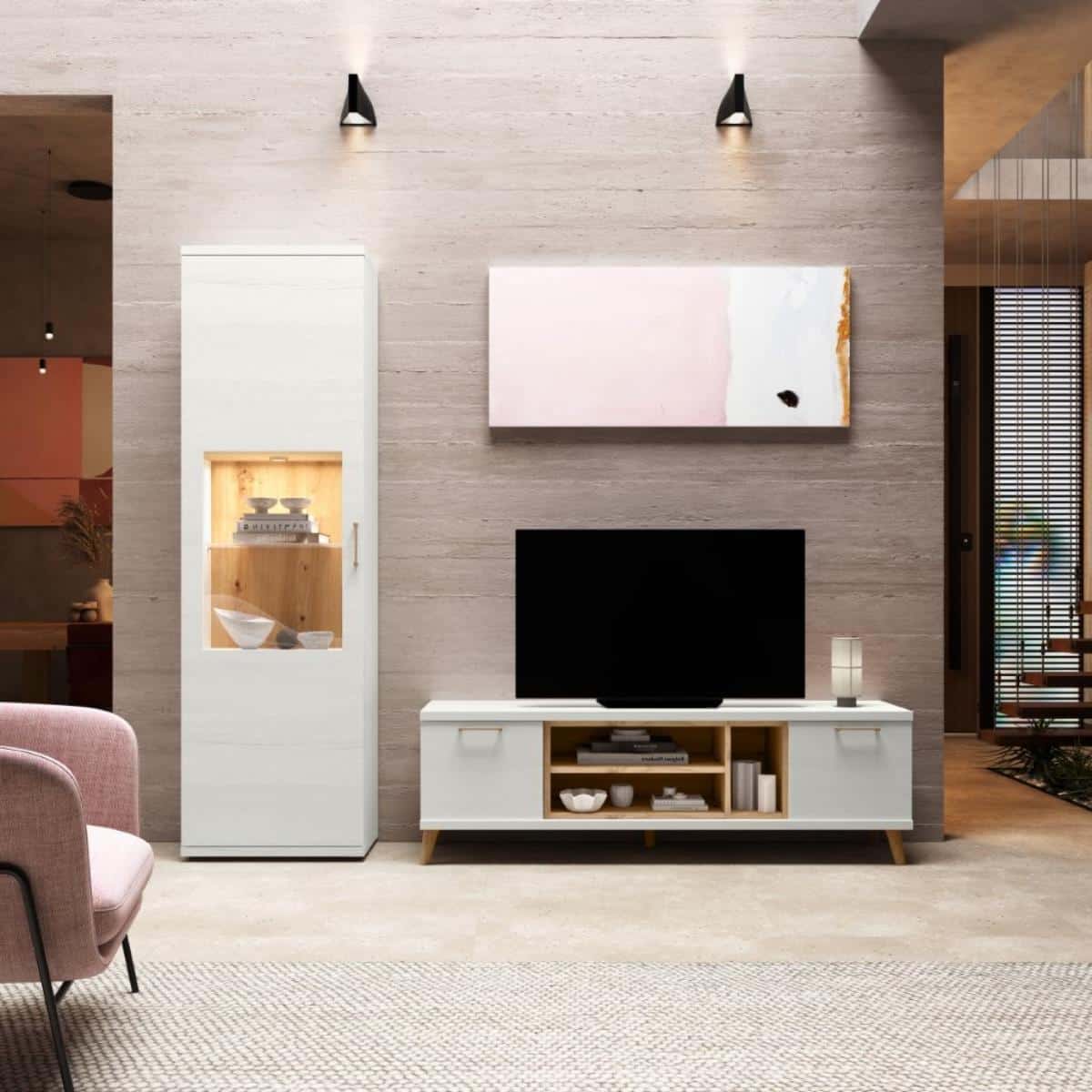 Logra el equilibrio perfecto entre luminosidad y calidez con esta composición de 220 cm, donde el color Polar inunda de luz tu salón mientras los detalles en color Artisán aportan una nota de madera natural. El conjunto destaca por su estructura elevada sobre patas redondas, que junto a los tiradores coordinados, crean una estética nórdica ligera y sofisticada. Esta combinación cromática se traslada también a los interiores, utilizando el tono Artisán en la trasera de la vitrina y en el cubo diáfano del mueble TV para generar una profundidad visual cautivadora.
