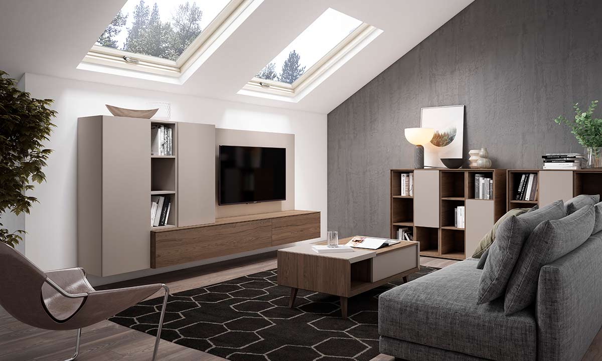 A tener en cuenta, la gran capacidad de este muebles salón, que siendo un diseño joven y fresco, contiene dos puertas verticales con bastante espacio y dos bajos de puertas abatibles. Gracias a que va suspendido, no tenemos sensación de mueble en exceso. Y no podemos olvidar la calidad de esta firma, todo fabricado con tablero Beladur de primera calidad, resistente a rayaduras y manchas. Todos los cajones con autocierre de serie al llevar guías metálicas ocultas Quadro de hettich.