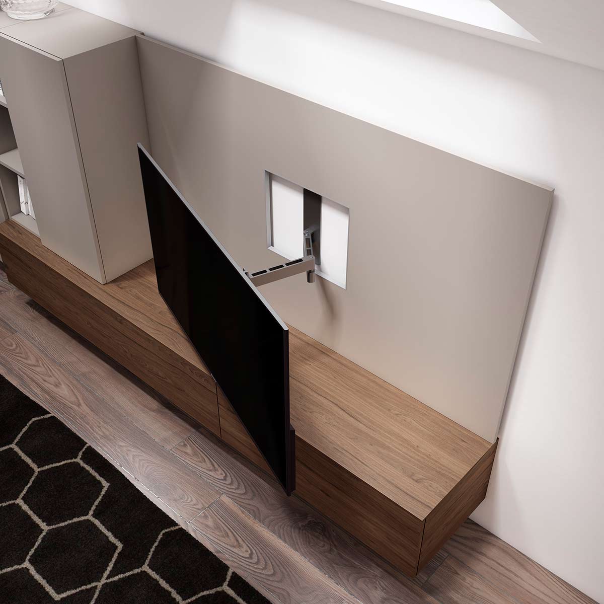 Con panel de TV con soporte vogel´s, a elegir fijo o móvil y disponen de varios tamaños según las pulgadas que tengas en el salón. Los paneles Tv tienen un regruesado especial de 3,5cm, para que no tengas problemas de espacio a la hora de esconder el cableado.