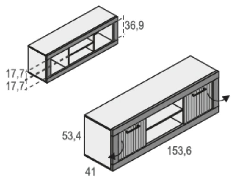 Mesa tv de 153,6 cm largo x 41 cm fondo x 53,4 cm alto. Pata Home 12cm. Pata Recta 2cm. Pata Marco 14cm. Base 3cm.