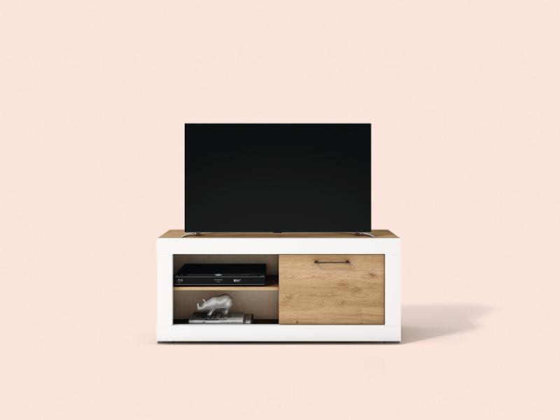 Mueble TV para espacios reducidos, con una medida de 126,2 cm de largo podrás poner una televisión de 49 pulgadas. Se adapta a cualquier estilo de muebles, ya que dispones de tres colores base diferentes y dos colores para combinar en frentes. Según tus necesidades y preferencias podrás incorporarle patas, como en nuestra primera opción o directamente a suelo, sin base.