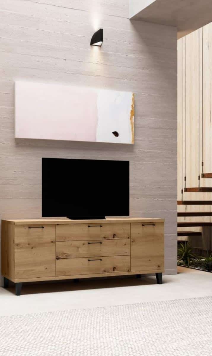 Es, en definitiva, una pieza clave para quienes buscan un mueble de televisión que combine una máxima capacidad de clasificación con un diseño de líneas limpias y contrastes potentes. Gracias a su elevación del suelo y su acabado detallista, este módulo no solo cumple una función práctica, sino que actúa como un elemento decorativo de estilo retro estilizado y gran valor arquitectónico en tu salón.