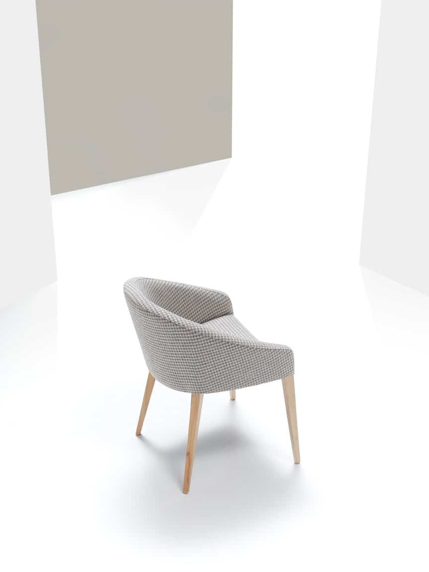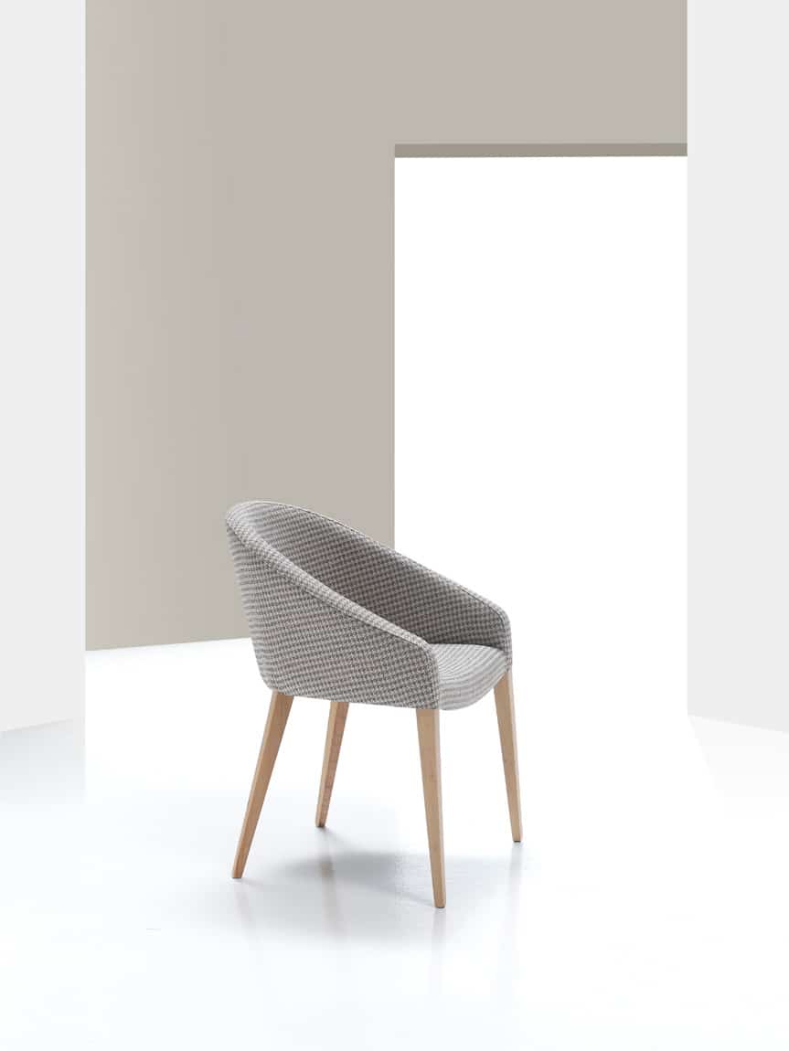 Precioso sillón con líneas curvas, con un diseño estudiado y muy meditado, para poder encajar debajo de la mesa de comedor. Con unas medidas muy reducidas para no dar sensación de volumen.