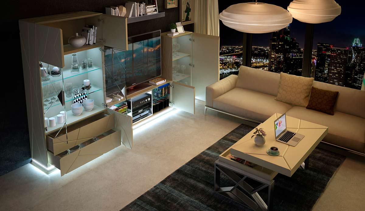 Completísima en cuanto a capacidad con vitrina de dos puertas con un diseño super actual, módulo tv y bodeguero/ aparador. Todo acompañado con un zócalo retroiluminado para darle más originalidad a la composición. No hay que olvidar las mesas de centro, muy prácticas y con un diseño único.
