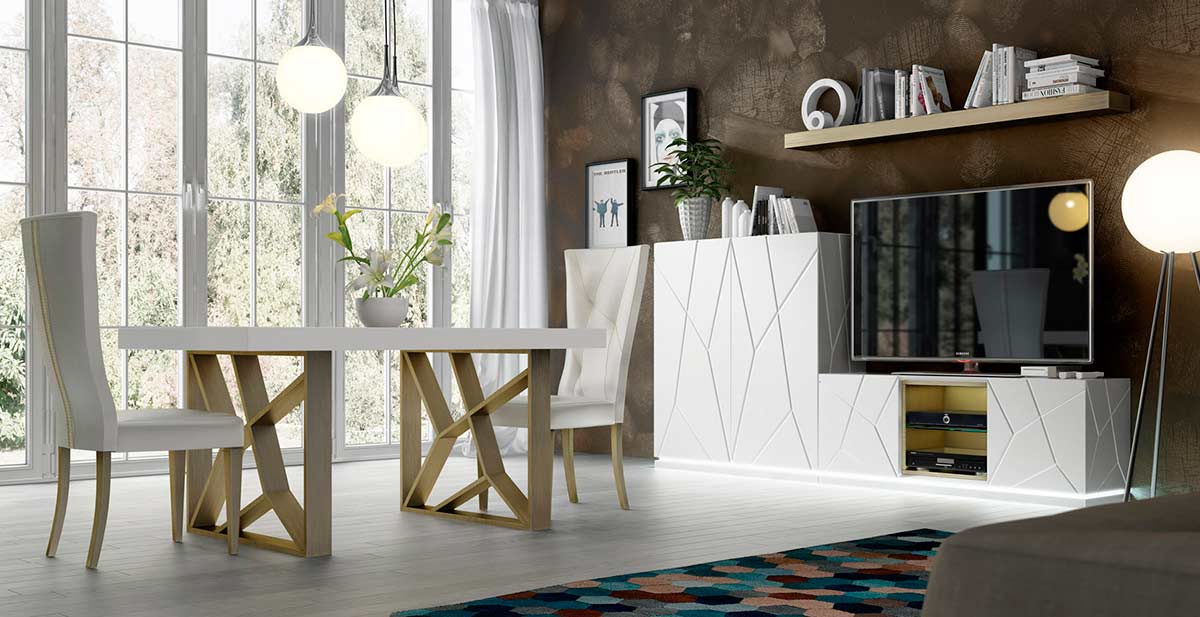 Un bonito mueble de salón con el zócalo iluminado con luz led, haciéndolo más especial si cabe. Personalízalo a tu gusto con la gran variedad de acabados a tu disposición. Hay muchos modelos de mesas de comedor y sillas de esta colección, que se pueden adaptar a cualquier acabado.