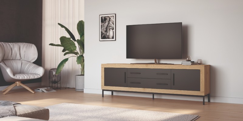 Mueble TV muy completo para tu salón comedor, con una medida de 200 cm donde podrás ubicar tu gran televisor y todos los utensilios necesarios en esta estancia. Con dos amplios cajones y una puerta a cada lado, no hace falta más!!