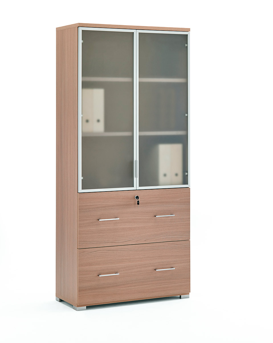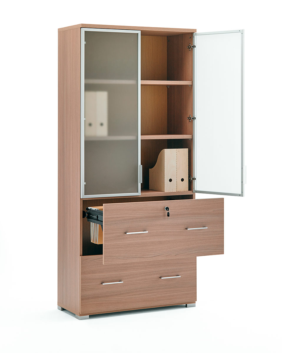 Librería con puertas de cristal y con dos archivadores incorporados. Se puede utilizar como módulo independiente y también se puede crear una composición mayor con los diferentes diseños de módulos que ofrece la marca, permitiendo amueblar desde pequeños despachos individuales hasta grandes espacios de trabajo.