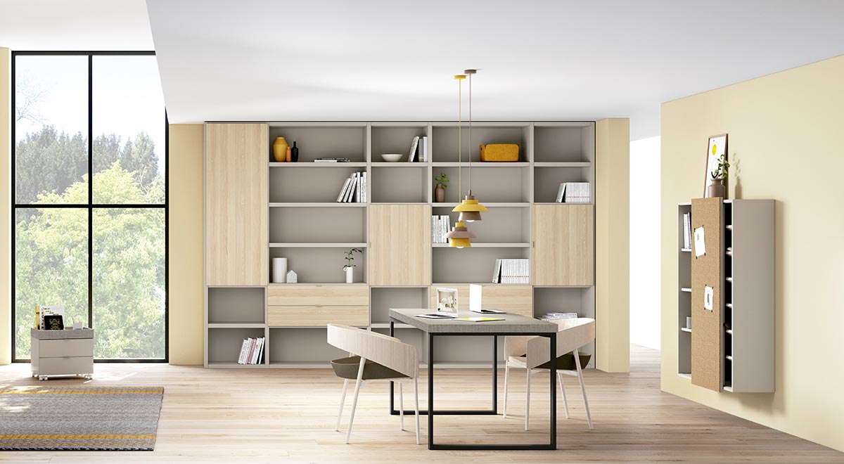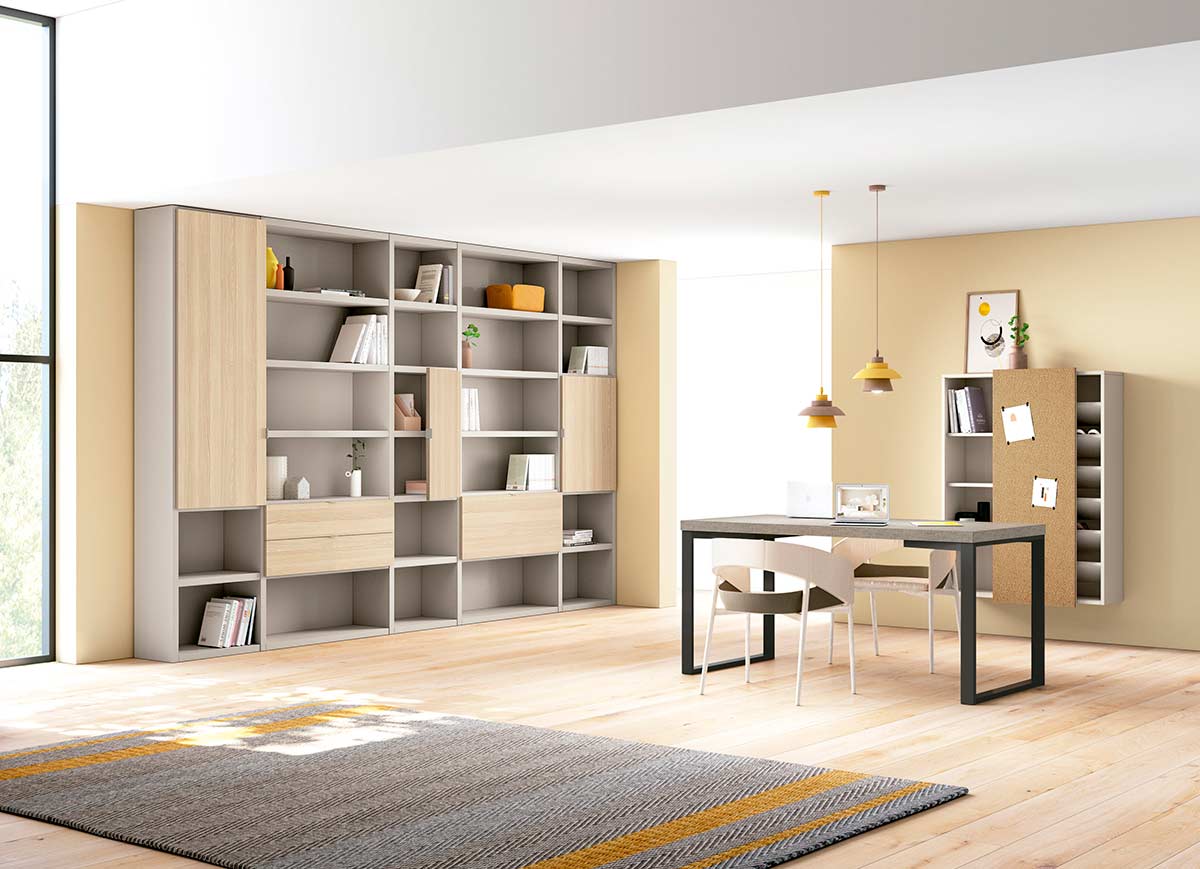 Nos encontramos ante un amplia librería que combina zonas abiertas con zonas cerradas (puertas y cajones), se presenta junto a una mesa de trabajo y un módulo auxiliar con puerta corredera.