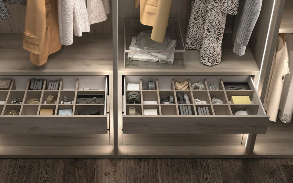 Simplemente, necesitas saber si prefieres contar con más estanterías o más espacio de perchas o cajones según prefieras colgar o doblar la ropa y adaptaremos las capacidades a ello. Por tanto, si no usas nunca cajones de pequeño tamaño, no se incluirán en tu vestidor y aprovecharás su espacio para algo más útil para ti.