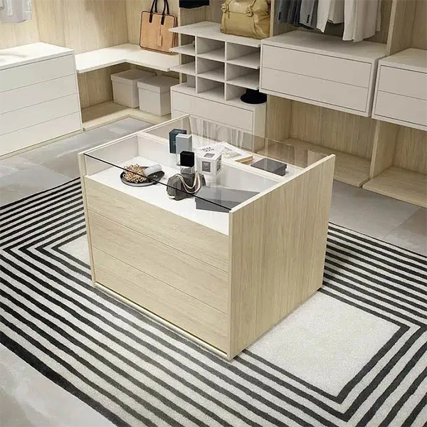 La siguientes imágenes nos sirven de ejemplo de vestidor con forma de U, además incluye la isla siendo el módulo auxiliar de cajones que va delante del vestidor con las tapas de cristal con la intención de tener visión para los complementos.