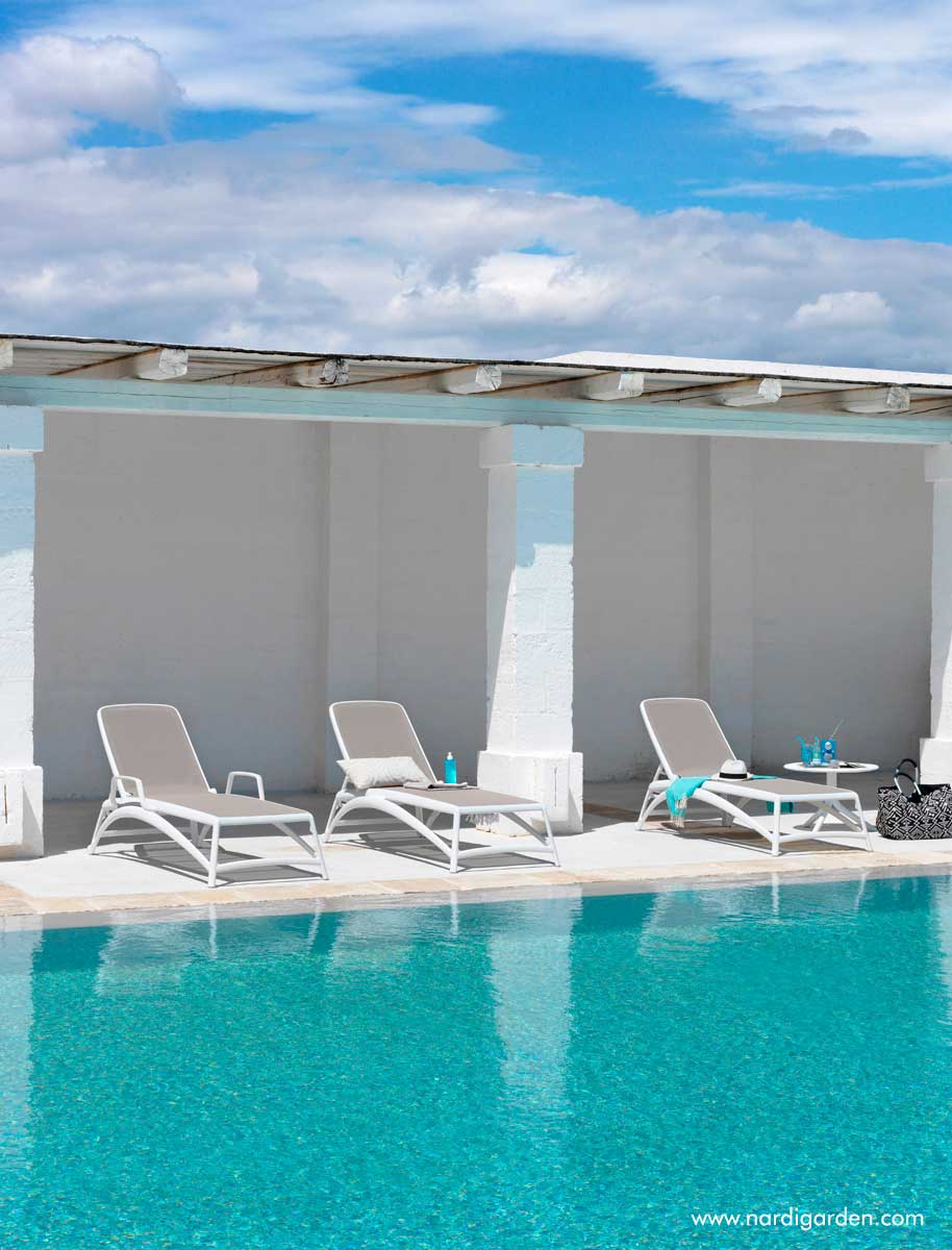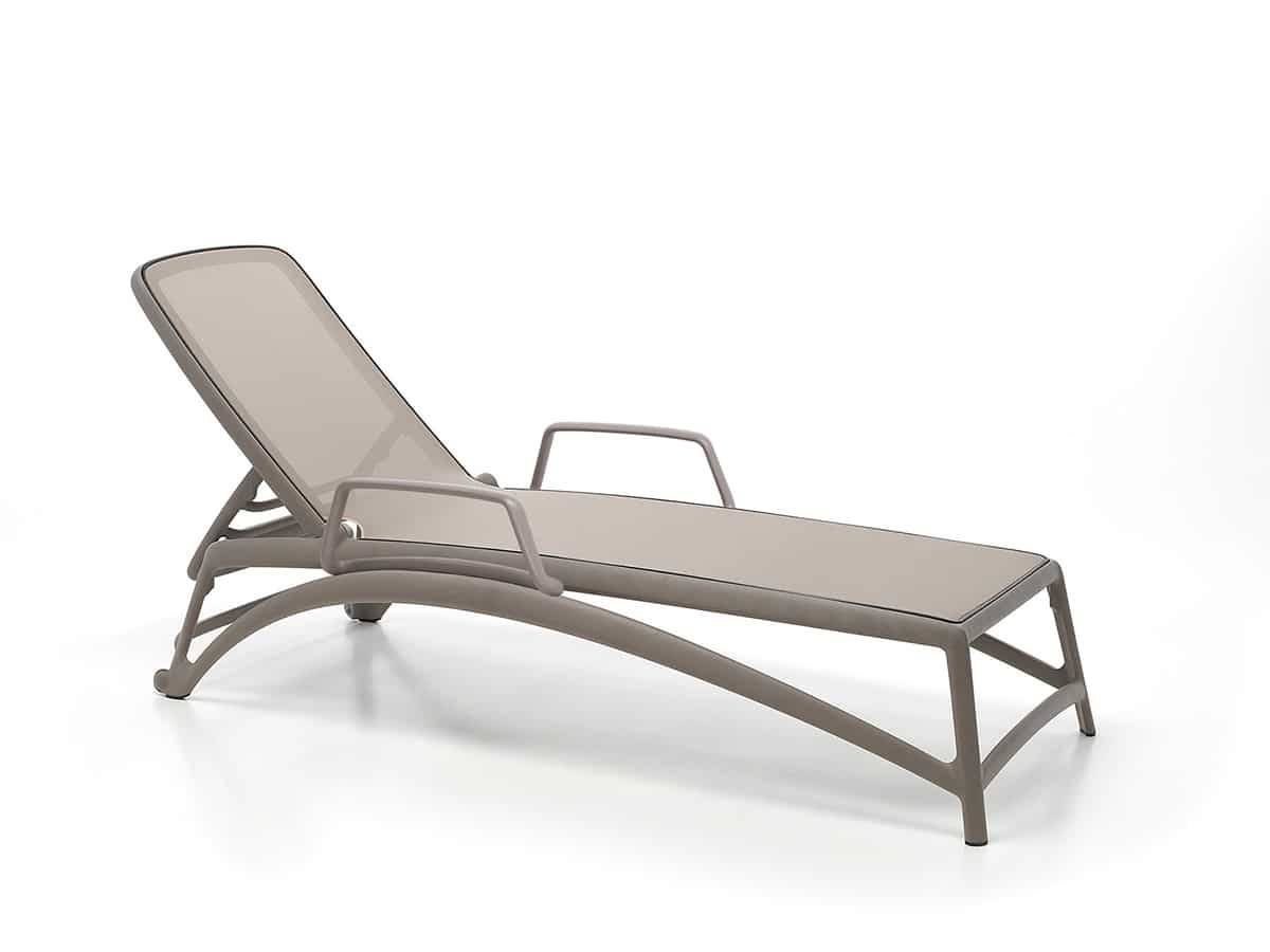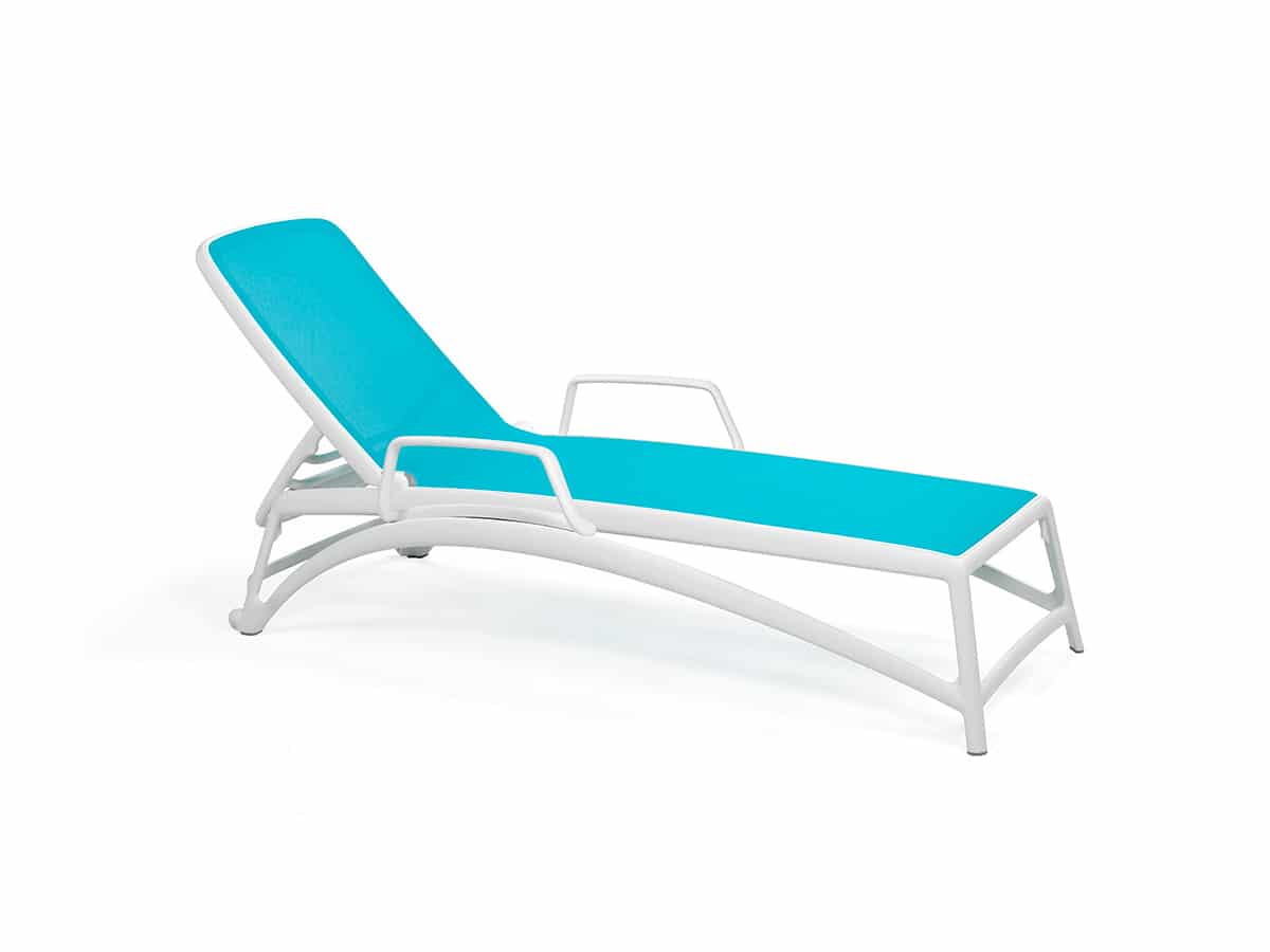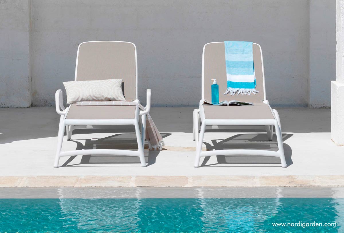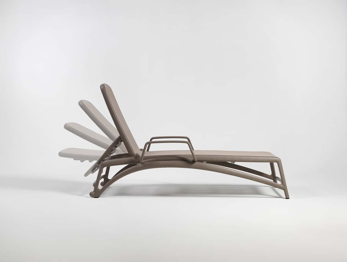 Formas ergonómicas que se adecuan de manera uniforme y elástica a la descarga del peso y diseño serpenteante, tumbona con estructura de resina de fibra de vidrio y tejido transpirante y que se puede cambiar. Respaldo regulable en cuatro posiciones. Apilable.Tumbona con brazos opcionales, como podemos observar en las fotografías la puedes elegir con o sin brazos, ¿cómo te gusta más?