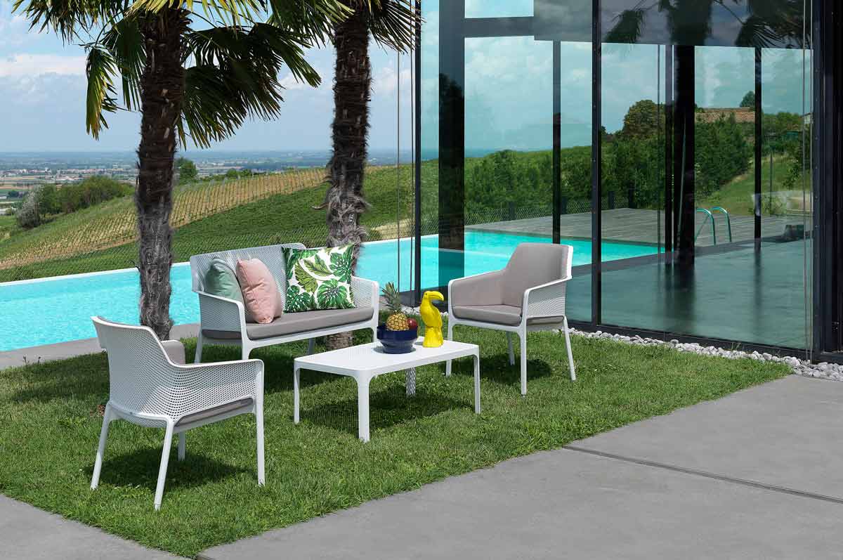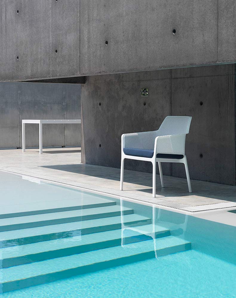 Romántico y empático, Net Bench es un banco para exteriores de dos plazas de resina de fibra de vidrio. Caracterizado por un motivo de agujeros cuadrados y rayados, presenta líneas pulidas, perfiles finos sin solución de continuidad y una amplia gama de cojines para combinar. Se ha combinado con dos sillones de una plaza y una elegante mesa de centro de la misma colección de muebles de jardín. Fabricada en resina de fibra de vidrio tintada en bloque con superficie rectangular caracterizada por un motivo perforado que recuerda el leitmotiv de toda la colección Net. Esta colección ha sido premiada varias veces por la creatividad de su diseño.
